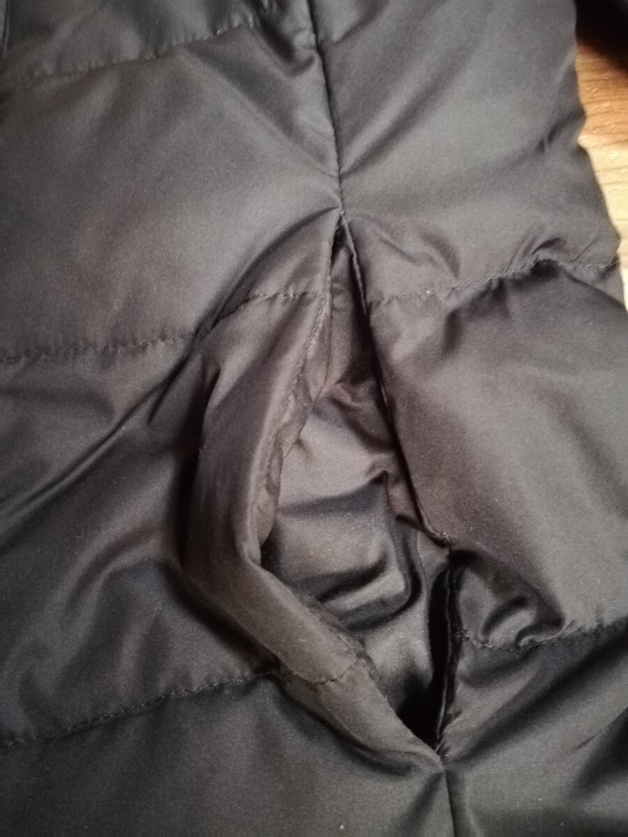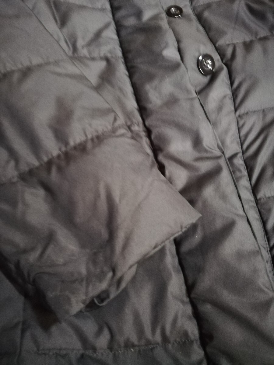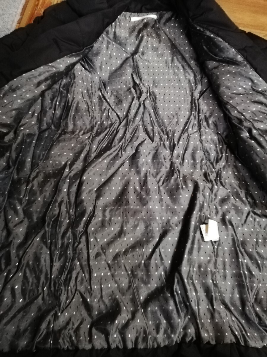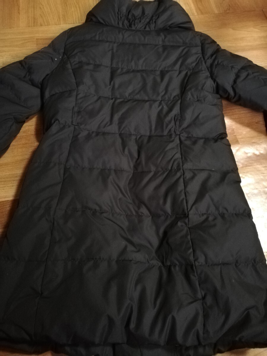 シンプルでスタイリッシュなブラックダウンジャケット、ボタン留めとサイドポケット付き。