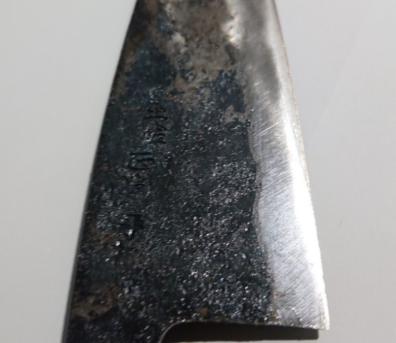 刃渡りは約150mm、鎚目が残る武骨な造りながら、割り込みには高級刃物鋼の青鋼を使用しているため、切れ味は保証付きです。