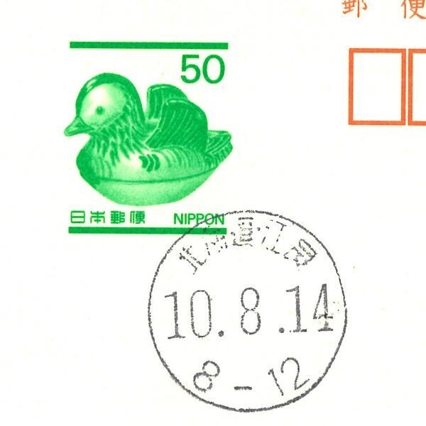 鴛鴦はがき50円☆丸型印☆北海道・江良・H10.8.14・8-12