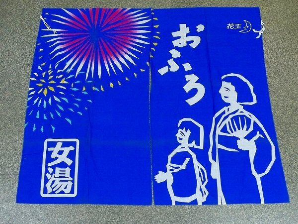 60NR10▲銭湯のれん・湯/ゆ・135cm×120cm・花王・花火 女湯 紺・古布・昭和レトロ・当時物・リメイク素材暖簾温泉風呂屋