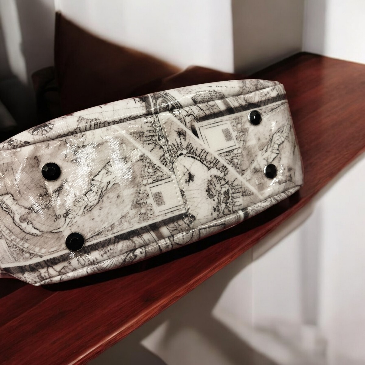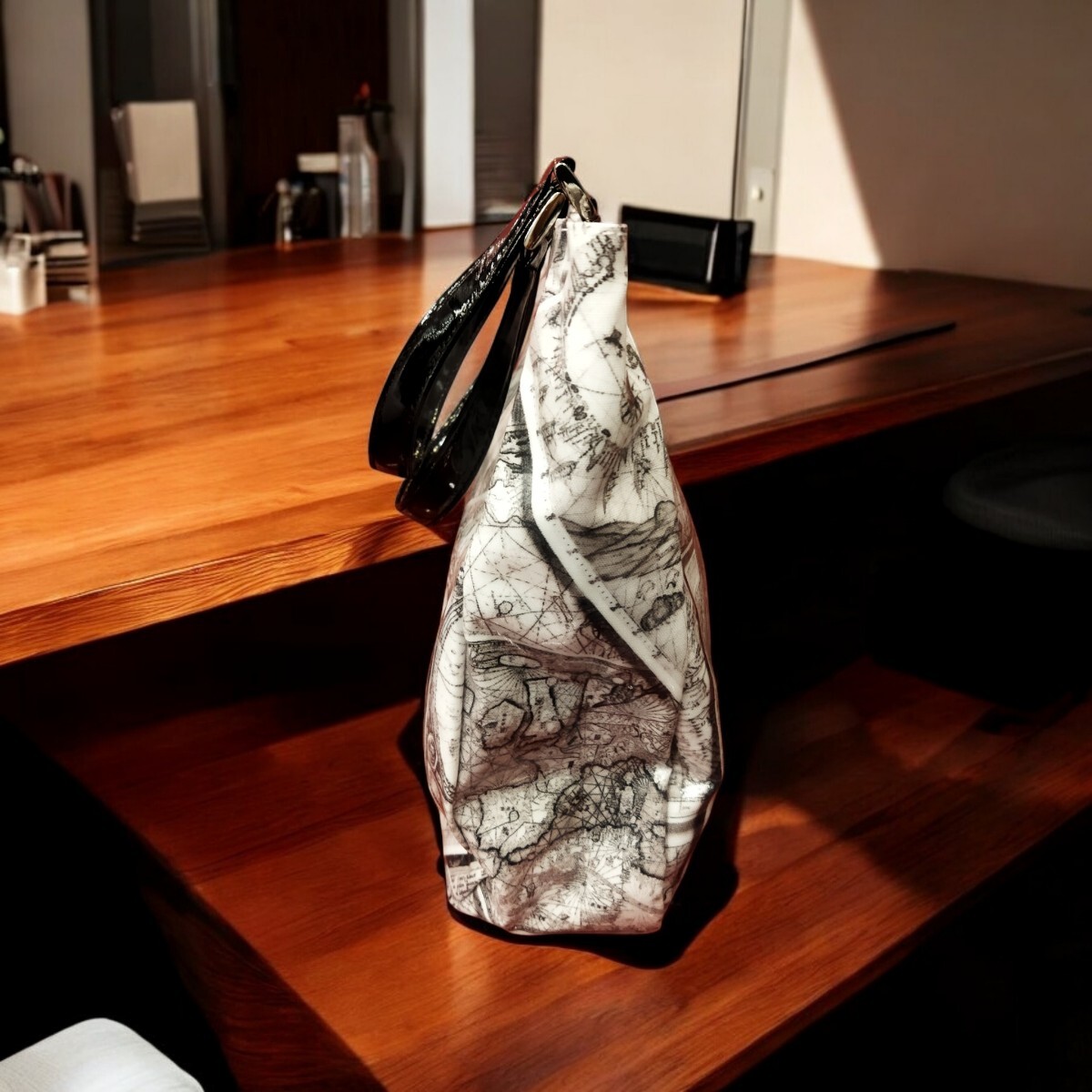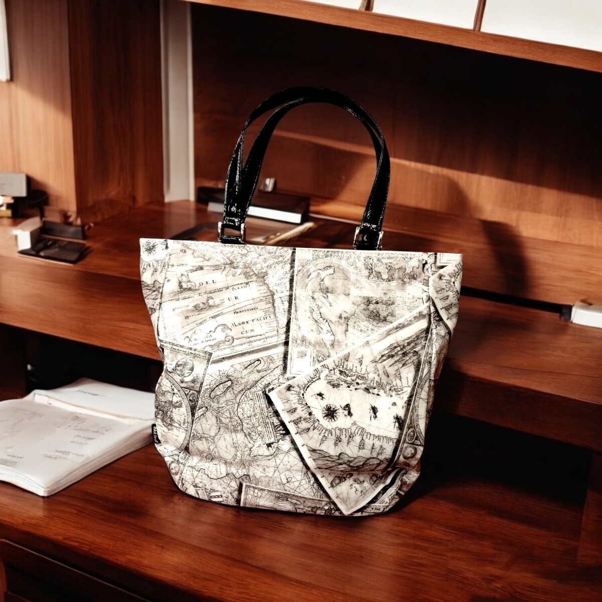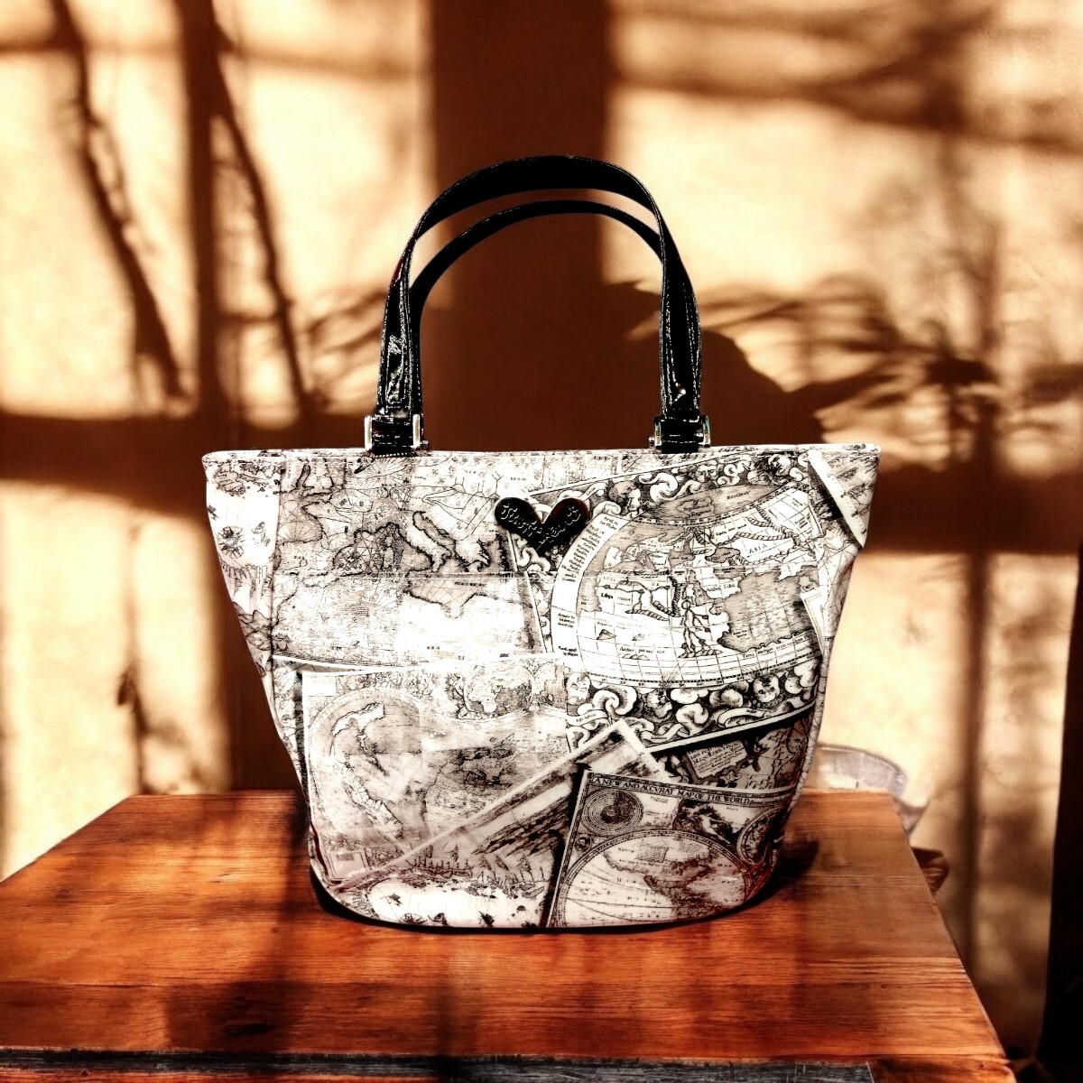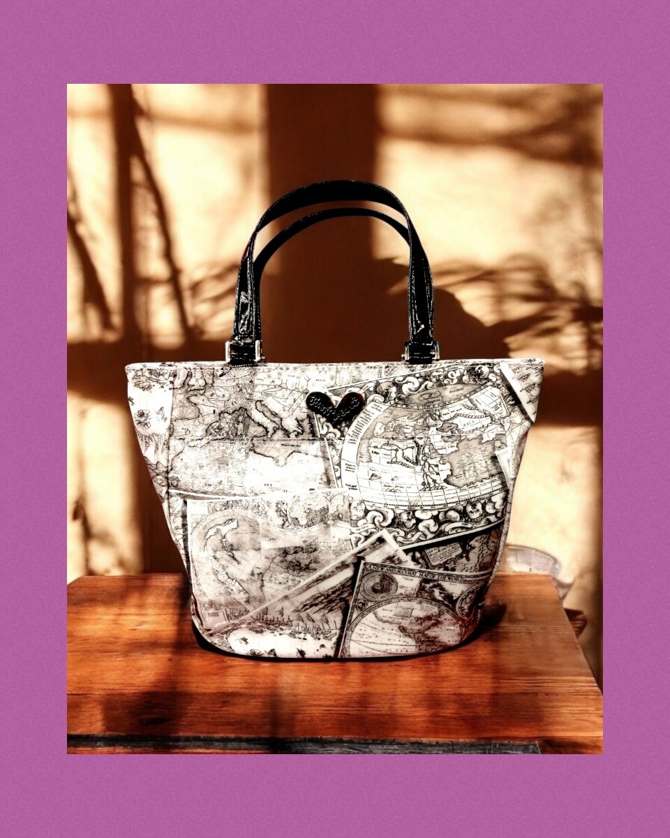 レトロな世界地図をプリントしたスペイン製生地を使用したコーディネートに取り入れやすいデザインのトートバッグです。