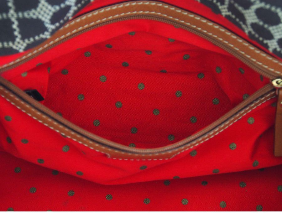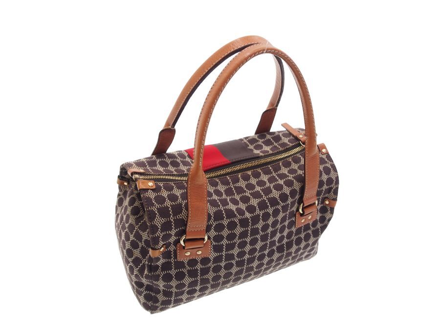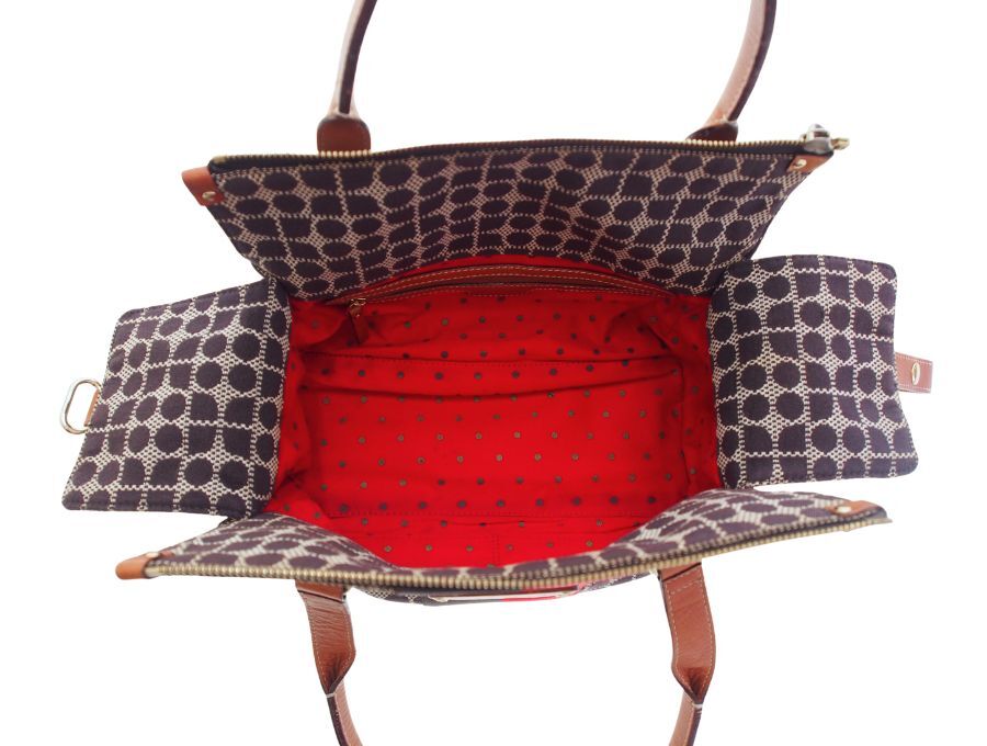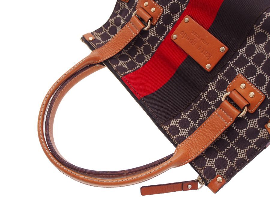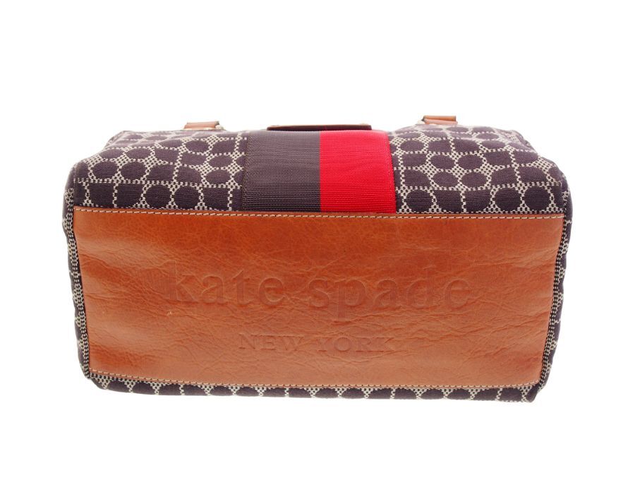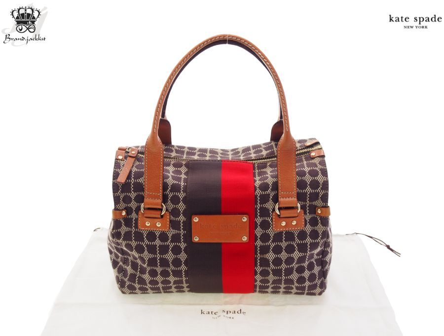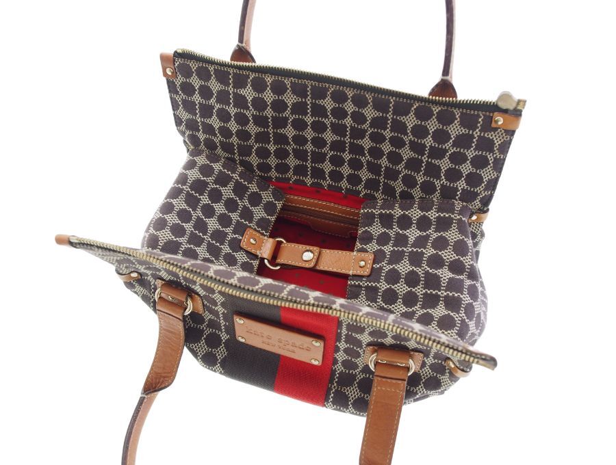 ニューヨークはセレブ御用達のケイトスペードのハンドバッグです。ノエル柄(CLASSIC NOEL STEVIE)のジャガード織の生地と、マチの部分がレザー素材になっております。ファスナーとボタンフックの二重の開閉になっていますので、大事なお荷物を盗難等からしっかりと守れます。内側の生地はケイトスペードらしく赤にゴールドのドット柄で可愛いすが、表側はブラウン系の落ち着いたカラーなので幅広い年齢層の方にお持ち頂け、秋冬コーデにピッタリのミニ ボストンバッグになっております。