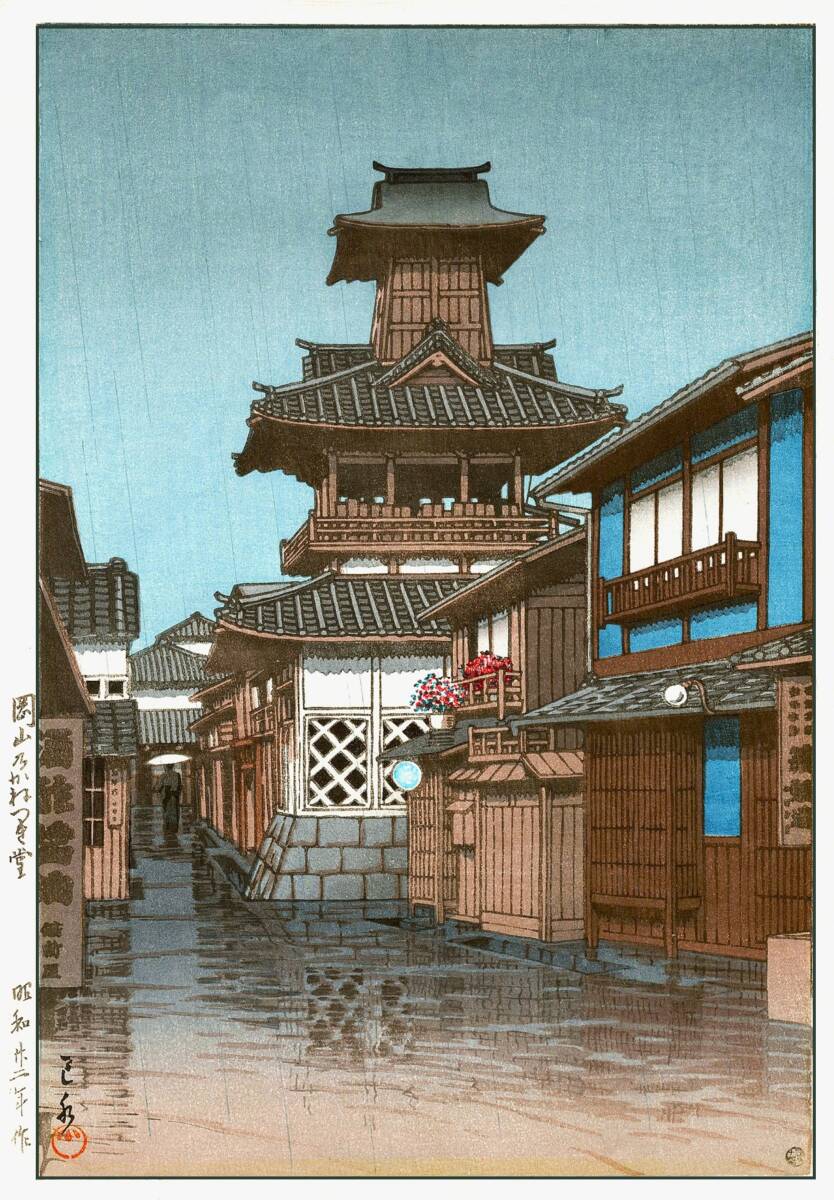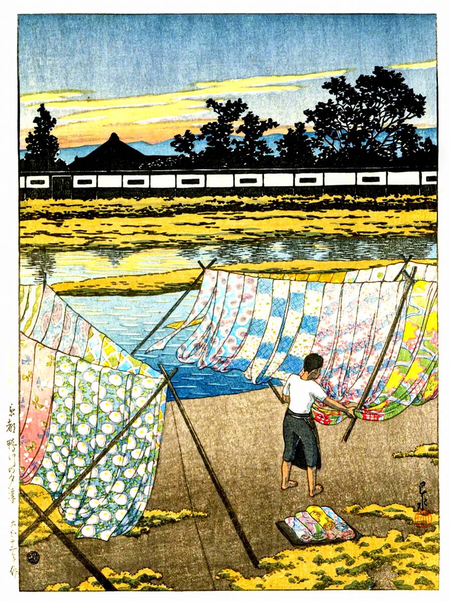 | ■商品説明■ | ■川瀬巴水 5作品(No341) 越前和紙複製仕上 ①岡山乃かねつき堂 ②出雲実保が関の朝 ③神田明神境内 ④京都の鴨川の夕暮れ ⑤木曽の寝覚 ■使用用紙 越前和紙 奉書紙 裏焼き ■一般のご家庭で額装観賞する場合、作品より大き目の額縁(作品サイズより縦横それぞれ7センチ程度以上)を選んでマット額装すると作品が映えます。 ■5作品 サイズ長辺 29.6cm×短辺21.0cm(余白部分を含めています) ■掲載画像とお渡しする画像の色合いが若干違う場合がございます(再現性) ■「越前奉書紙使用」 裏焼き 5作品。 ■Pixelサイズ長辺5000 解像度480dpiで複製仕上げ。 Wikipedia 川瀬 巴水(かわせ はすい、1883年(明治16年)5月18日 - 1957年(昭和32年)11月7日)は、日本の大正・昭和期の浮世絵師、版画家。本名は川瀬 文治郎(かわせ ぶんじろう)。衰退した日本の浮世絵版画を復興すべく吉田博らとともに新しい浮世絵版画である新版画を確立した人物として知られる。近代風景版画の第一人者であり、日本各地を旅行し旅先で写生した絵を原画とした版画作品を数多く発表、日本的な美しい風景を叙情豊かに表現し「旅情詩人」「旅の版画家」「昭和の広重」などと呼ばれる。アメリカの鑑定家ロバート・ミューラーの紹介によって欧米で広く知られ、国内よりもむしろ海外での評価が高く、浮世絵師の葛飾北斎・歌川広重等と並び称される程の人気がある。仮名垣魯文は伯父に当たる。 |