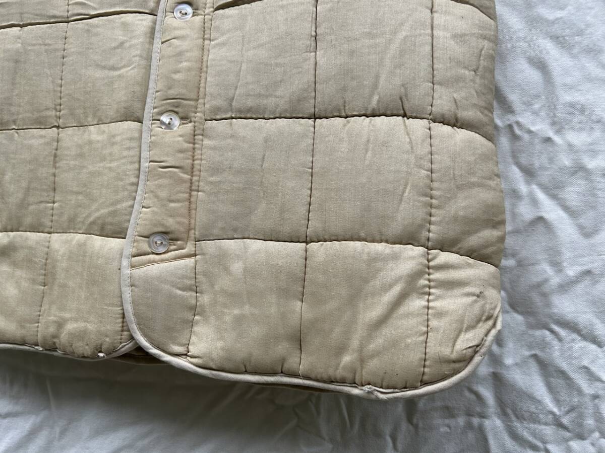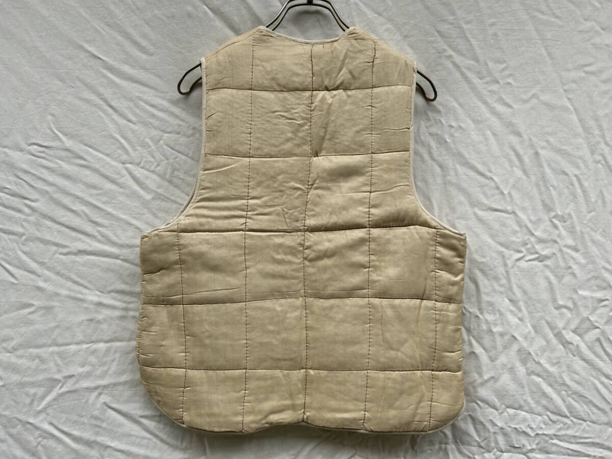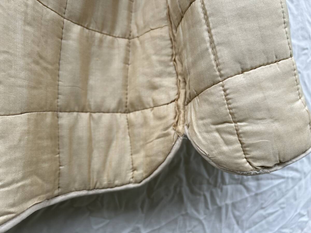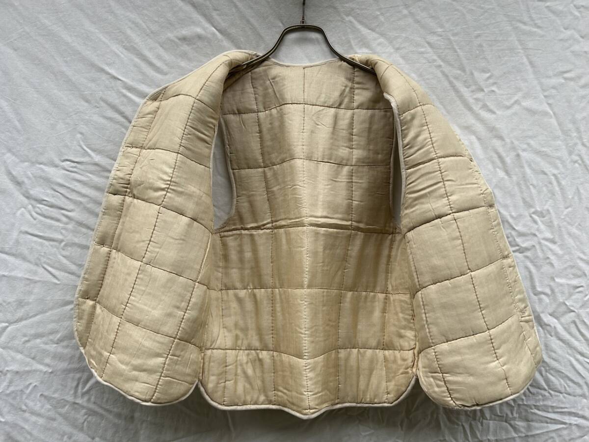 説明:非常に雰囲気のある当時もの一枚。シェルボタン、シルク生地、中綿入り。当時はこの手の綿入りは布団屋さんが作っていた様です。アウターでもインナーでも面白いと思います。なかなか出てこないので気になる方はお早めに!!