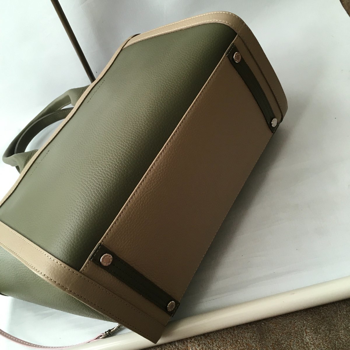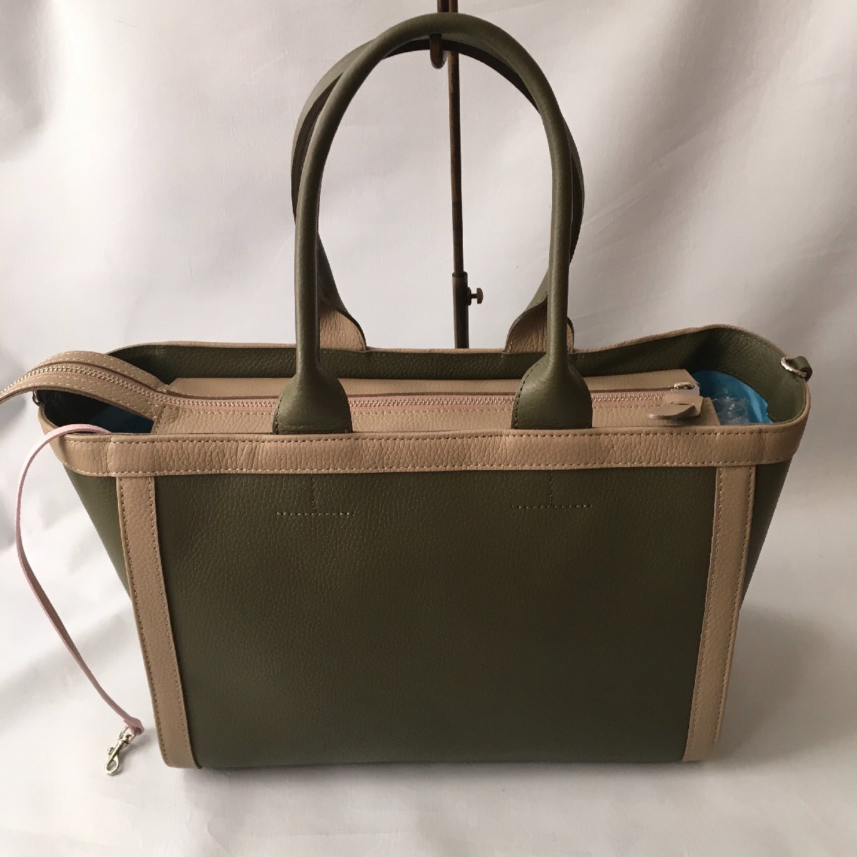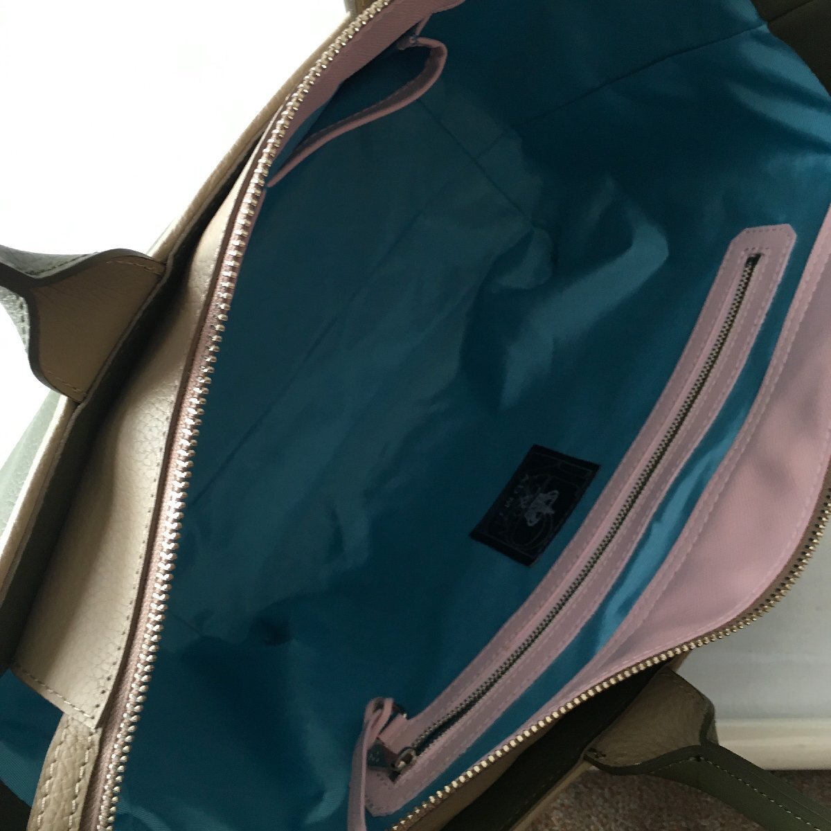 開口:ファスナー 内側:メイン1室、ポケット3個(オープン1個、スナップボタン付1個、ファスナー付1個)、キーストラップ 底鋲:4個 サイズ:W32(底部)~42(口元)×H23×D16.5cm ハンドル立ち上がり:約19cm ※ショルダーストラップは付いていません。(元々ついていません) 重さ:約790g 金具:SILVER マテリアル:牛革。 |