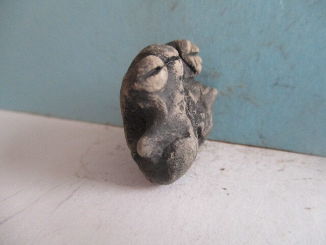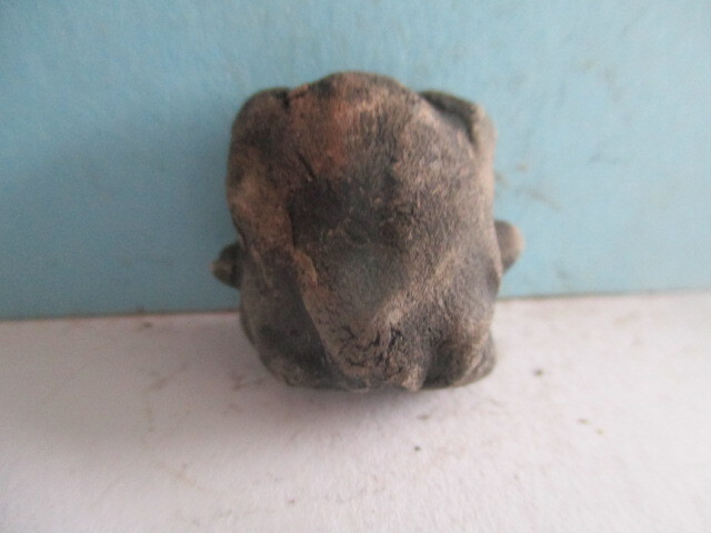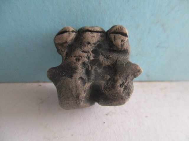 青森県屈指の土偶コレクターからあずかりました。2代前のご先祖が青森県内の遺跡から発掘したそうです。供物といっしょに祭壇に飾るなど祭祀的な意味があるそうです。全高約2.2cm。土中から掘り出したものですので鑑賞を妨げない程度のヒビやカケ、擦れ、表面の剥離があります。水につけると、ほんの少し土臭がします。金色に輝く微小な鉱物が少し含まれていますが、砂金ではなく、雲母であると思われます。これまで一度も鑑定に出したことがなく、正真正銘の真贋不明ですが、トラブル防止のためあえてレプリカとして出品させていただきます。自己紹介欄にオークション休業日を記載させていただいております。お手数とは存じますが、ご入札前にお読みいただければ幸いです。よろしくお願い申し上げます。