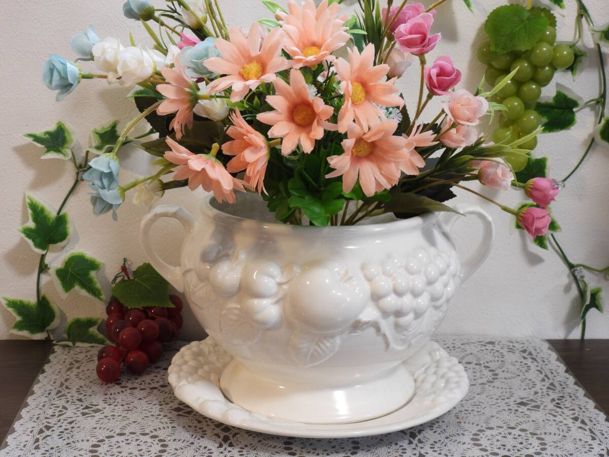 植木鉢・白のフルーツエンボスに貫入仕上げのヨーロッパ調の植木鉢受け皿付き