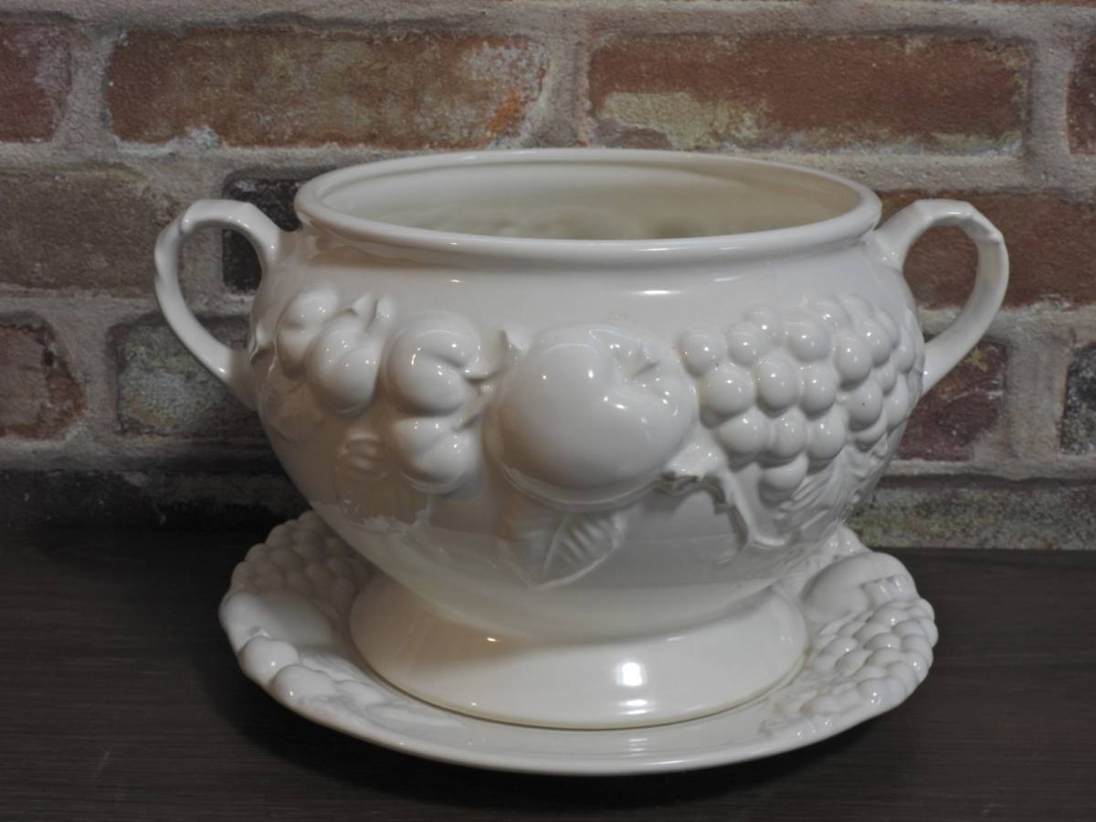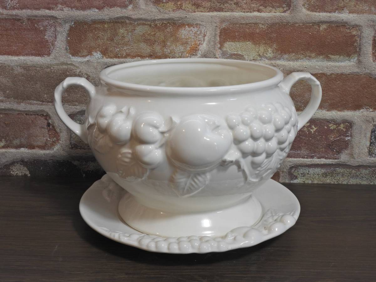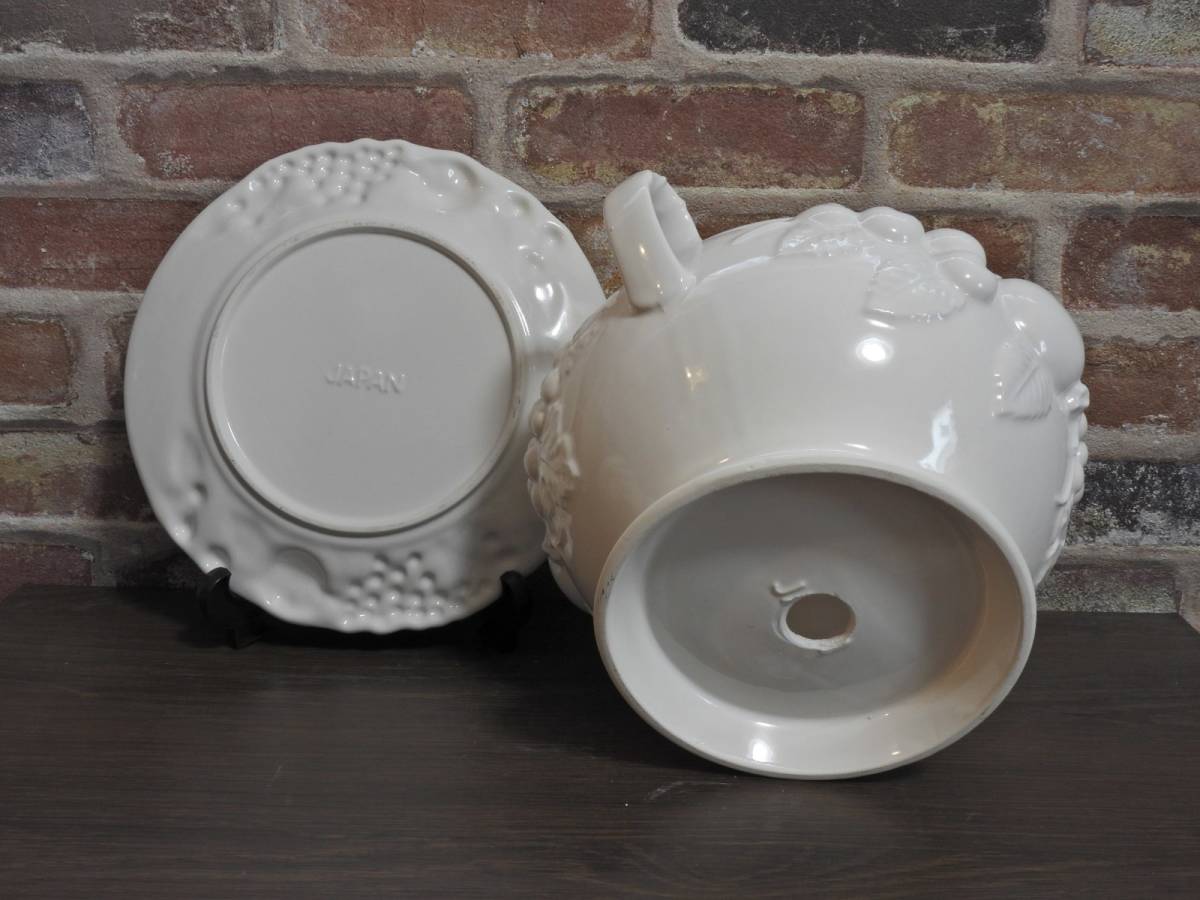 植木鉢・白のフルーツエンボス仕に貫入仕上げのヨーロッパ調植木鉢受け皿付き