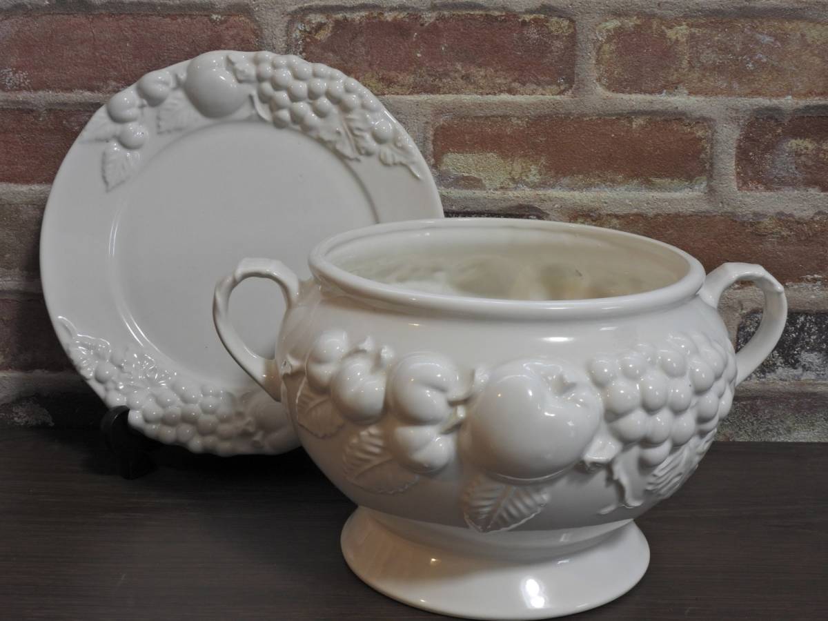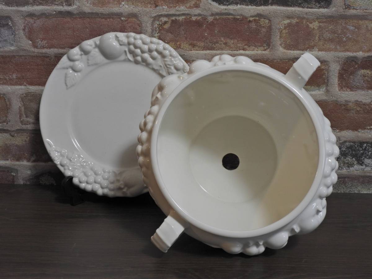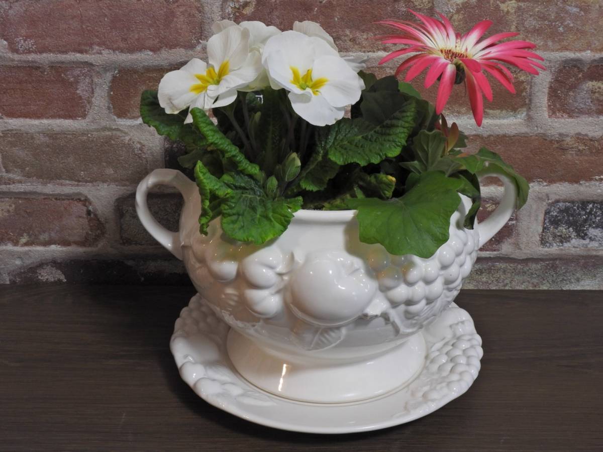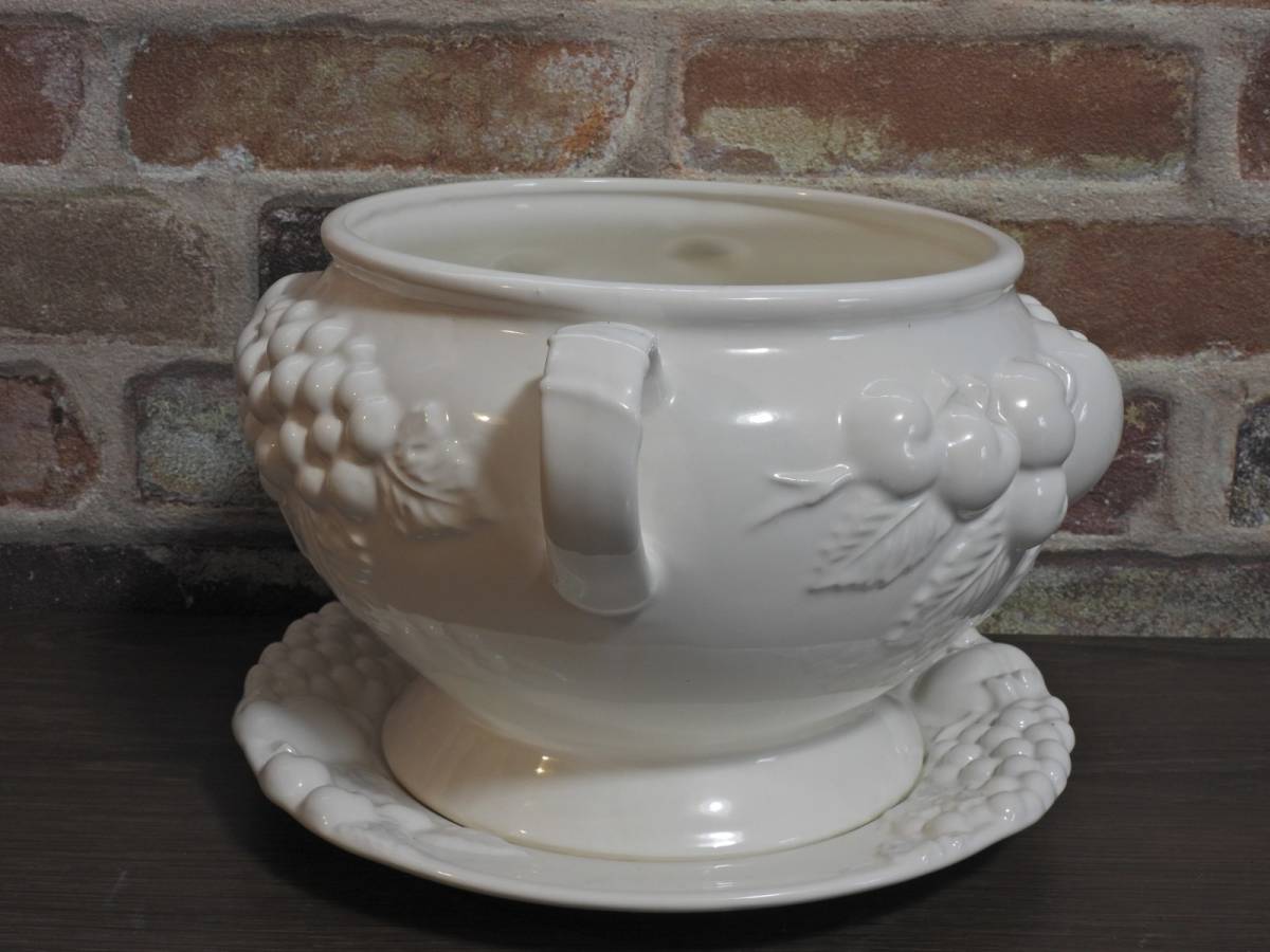 植木鉢・白のフルーツエンボス仕に貫入仕上げのヨーロッパ調植木鉢受け皿付き