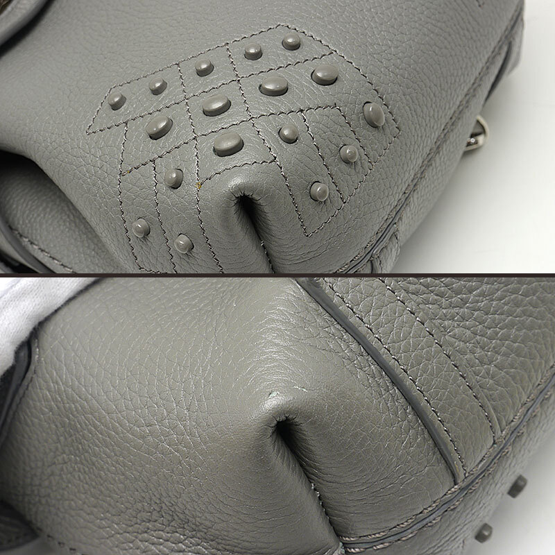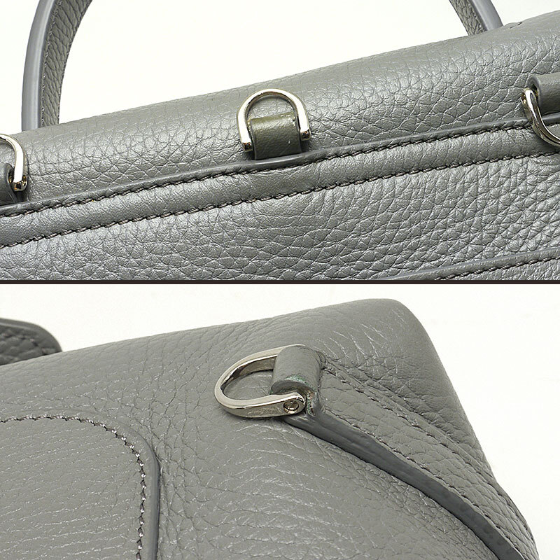 【外側】角のスレや小さな剥がれ、角部分の金具にスレ、コバに僅かな剥がれ、ショルダー装着金具付け根のレザーに多少の傷みあり