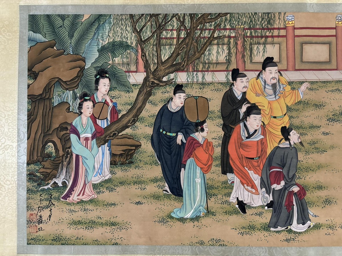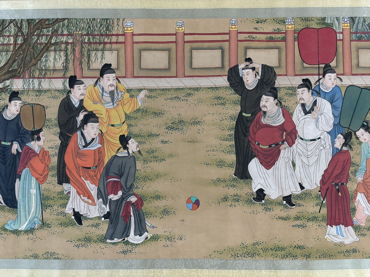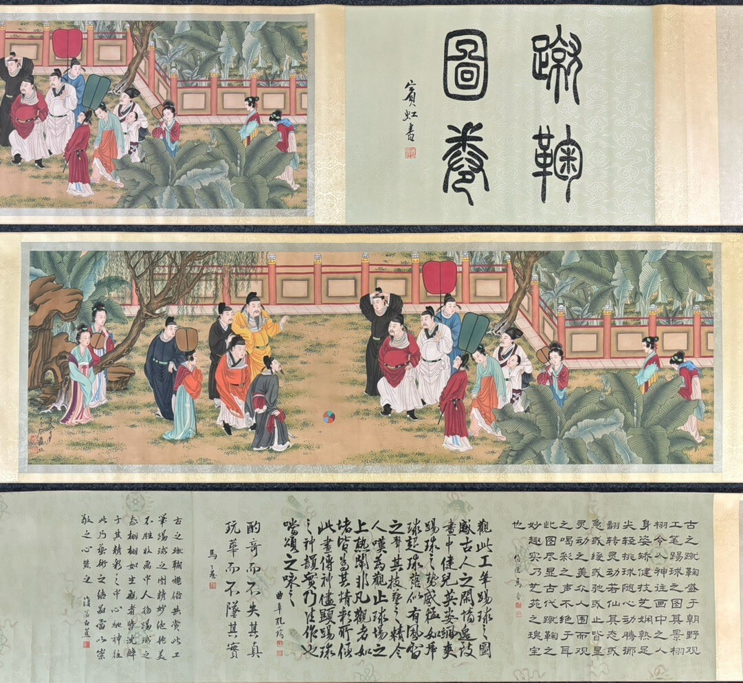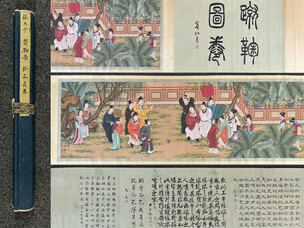 【瓏】「張大千作 蹴鞠図珎品長巻」近代画家 肉筆絹本 掛け軸 書画横物 巻き物 中国書画 古美術 骨董品 蔵出