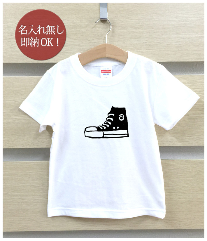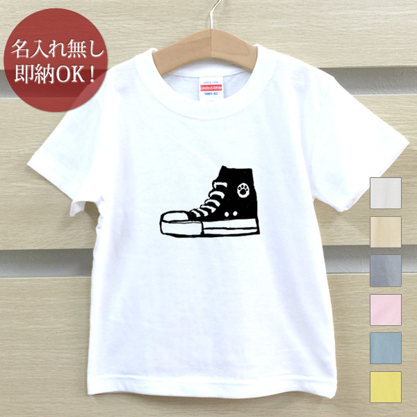ひも付きスニーカーの手書き風イラストのベビー&キッズTシャツです。靴好きのお子様へのプレゼントに♪