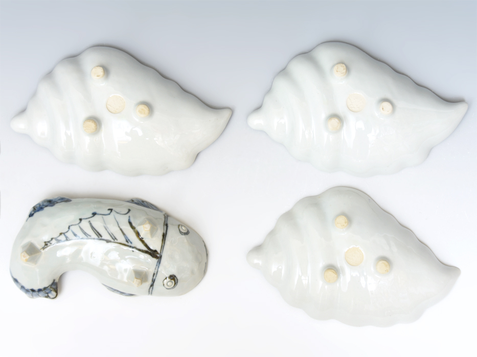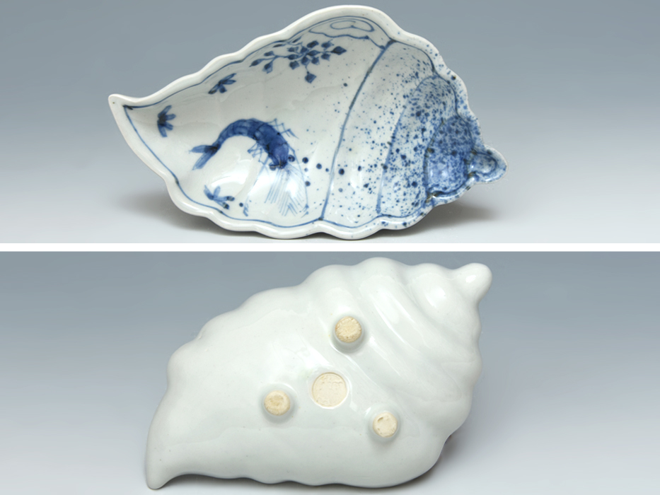 【染付貝型海老文向付】 横幅:18.1㎝ 奥行:11.6㎝ 高さ:4.4㎝ 【染付鯰型向付】 横幅:16.7㎝ 奥行:9.5㎝ 高さ:5.1㎝ |