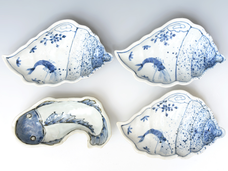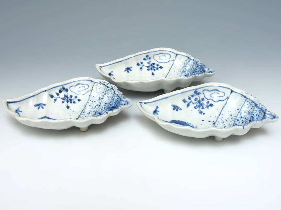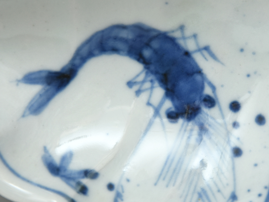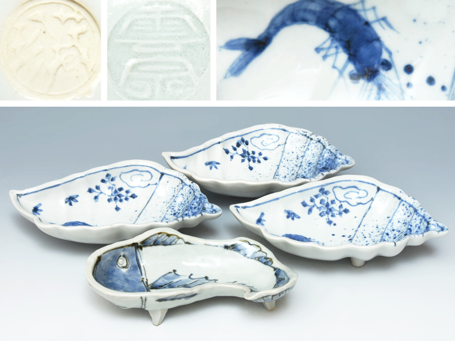 染付貝型海老文向付 3客 染付鯰型向付 1客 陶磁器 ナマズ エビ 古染付 懐石道具 懐石料理 料理皿 |