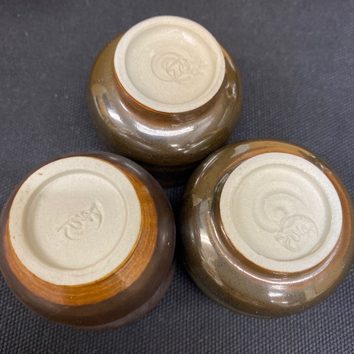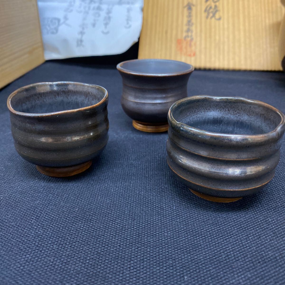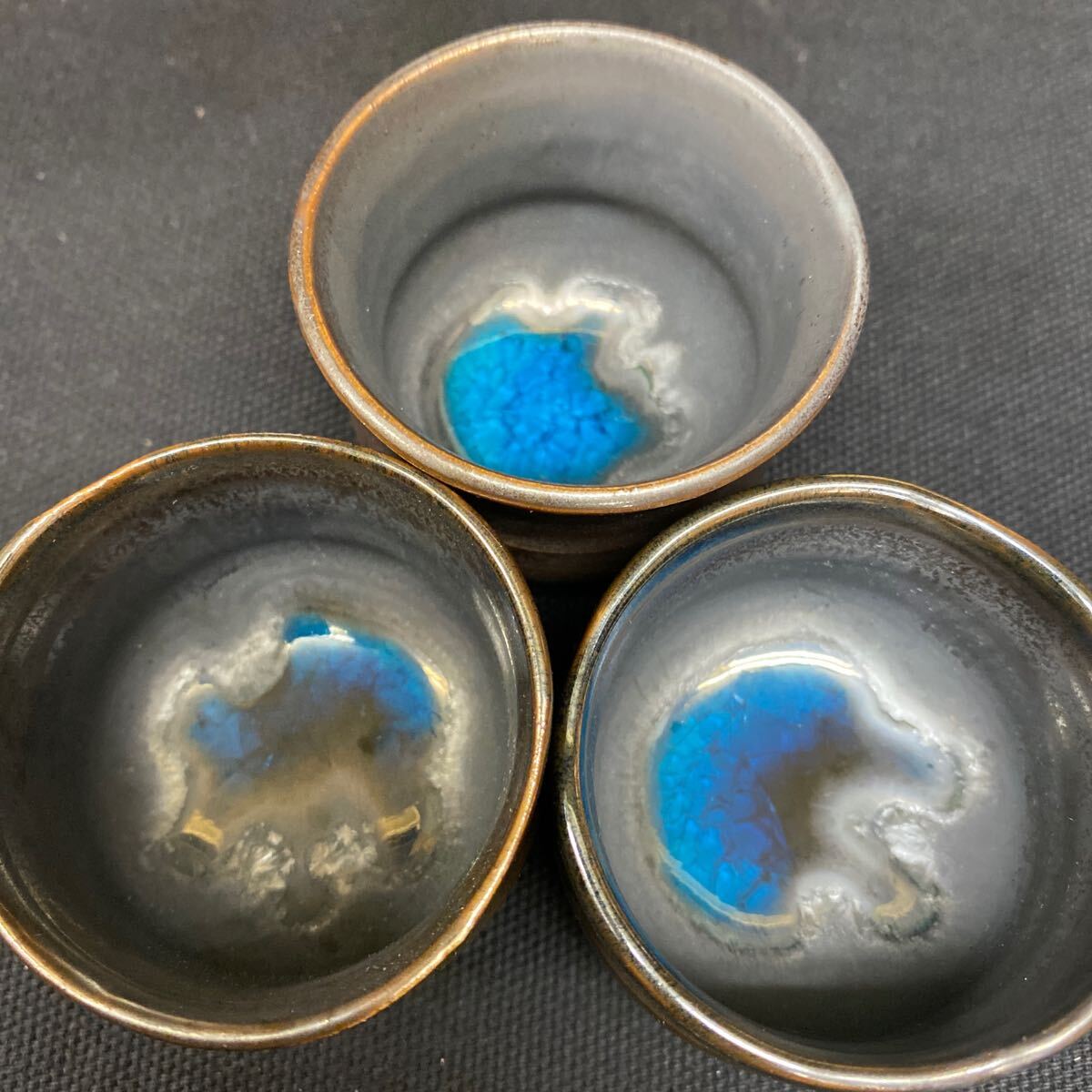 ぐい呑み3個は、コバルトブルーの海の輝きを放つガラスと陶器が融合した作品で2つと同じものがありません