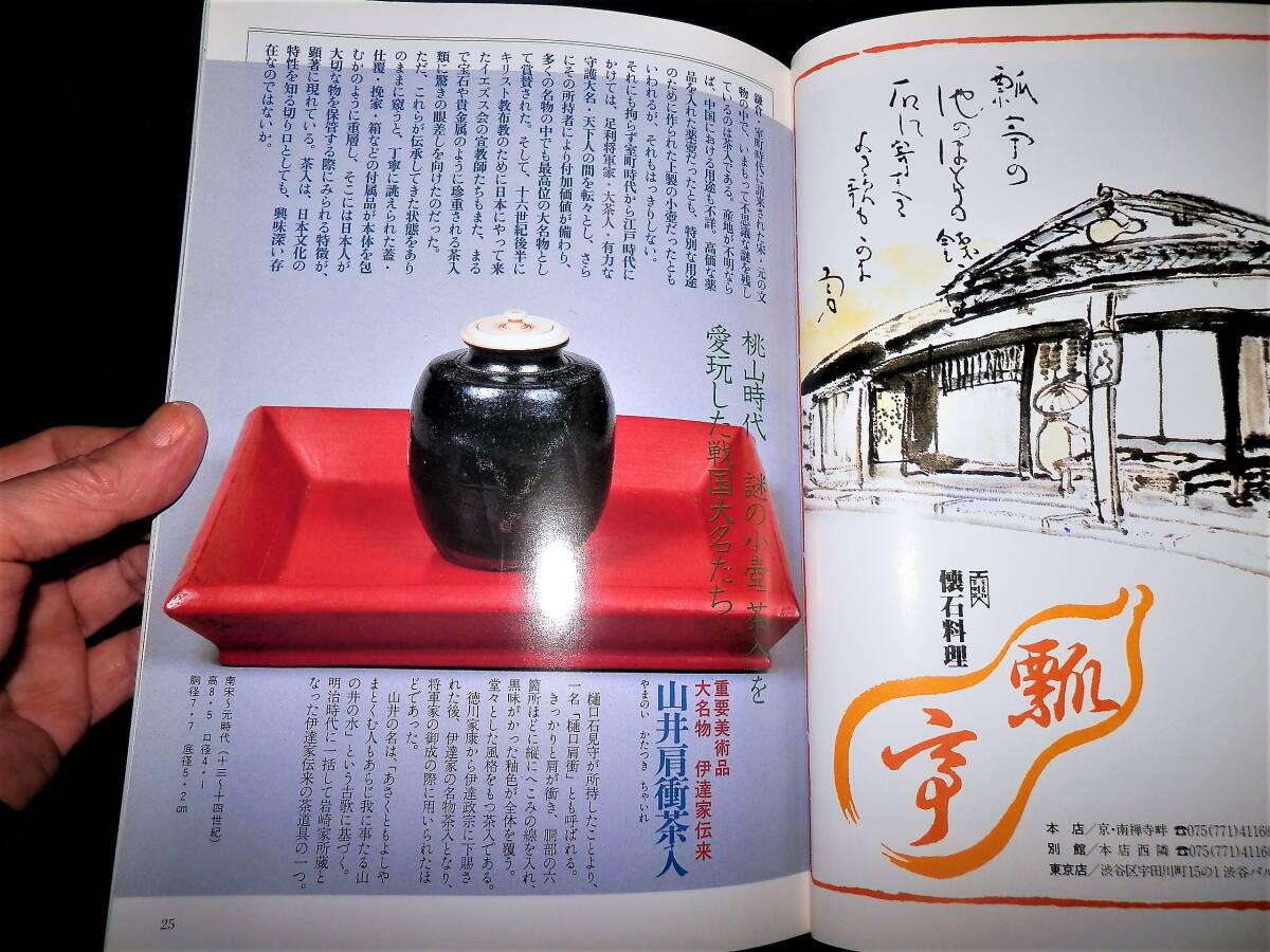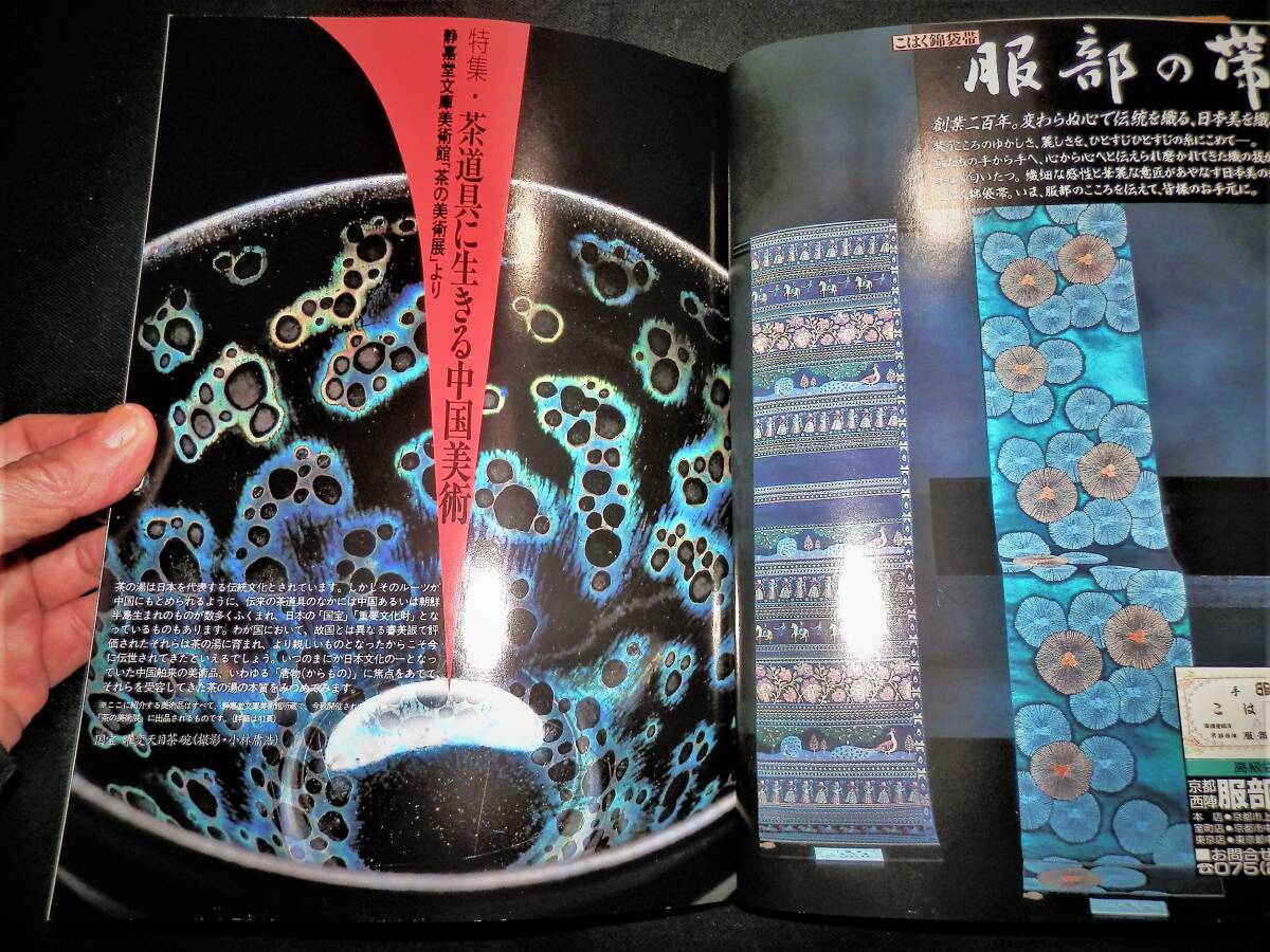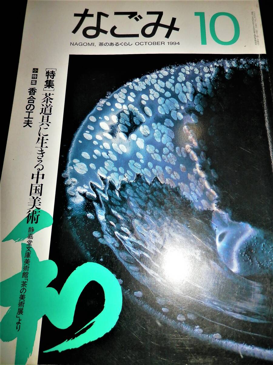 ■■『茶道誌』・・・■■ ■■『なごみ』・・・■■ **”(1994年10月・通巻第178号)”** ―”特集”― ●●『茶道具生きる中国美術』・・・●● ―”静嘉堂美術館・「茶の美術展」・より”― **”(約・37頁) ”** ★茶の湯は日本を代表する伝統文化とされています。 しかしそのルーツが中国にもとめられるように・伝統 の茶道具のなかには・中国あるいは朝鮮半島生れのも のが数多くふくまれ・日本の・「国宝」・「重要文化 財」・となっているものもあります。 わが国において・故国とは異なる審美眼で評価された それらの茶の湯に育まれ・より親しいものとなったか らこそ今に伝世されてきたといえるでしょう。 いつのまにか日本の文化の一となってきた中国舶来の 美術品・いわゆる・「唐物」・に焦点をあてて・それ らを受容してきた茶の湯の本質をみつめてみます。 ―”小特集”― ●●『香合の工夫』・・・●● ―”趣向の茶の湯にみる小さな冒険心”― **”(6頁・カラー) ”** **”監修・文―三田佳子”** ■発行日=平成6年10月1日。 ■発行所=株式会社・淡交社。 ■サイズ=18×25.5cm。 ■定価=800円。 ■状態。 ●表紙に・多少の・キズ・ヤケが有ります。 ●本誌内に・多少の・ヤケが見えますが ●大きなダメージは・無く ●年代的には・良い状態に思います。 ◆◆注意・・・◆◆ ★表紙開き側縦に、折れ跡・(読みぐせ)・が 有りますので御理解下さい。 ★発行日より・経年を経て下ります。 コンディションに係らず・古書で有る事を 充分に御理解の上・御入札下さい。 ★神経質な方は、入札をご辞退下さい・!! ●全・128頁・・・!! ●特集の・・・!! ◆「茶道具生きる中国美術」・は・約39頁。 ●小特集・「香合の工夫」・・・!! ―”(6頁)”― **”監修・文―三田佳子”** ★香合という小さな器には・一つの世界がある。 蓋物で・中に香木や練香を入れて使う掌にのるほど小 さいこの器は・茶の湯の中では炭点前に香を入れて・ まっさきに姿をあらわす。 炭手前のないときは・紙釜敷にのせて床の間に飾り・ 客に見てもらう。 客もまた・その香合から・その日のお茶の趣向を感じ 取るのである。 香合はかたちが何かの意味をもっている。 型物香合では大亀や・橋杭・辻堂・開扇などがあるが ・作家や職人の自由な発想で・さまざまのかたちが作 られている。 れが茶の中で趣向に使われると・ぐっと大きな存在と して生きてくるのである。 ●「香合は・強力助っ人」・・・● ―”茶会の趣向を考える”― ◆香合―砧・表完作。 ◆水指―山本雄一作。 ◆茶碗―清閑寺窯・杉田祥平作。 ―”人生は旅路・「風炉」・名残の茶”― ◆掛物―弧篷庵・卓厳筆。 ◆花入―佐藤光夫作。 ◆香合―砧・表完作。 ―”人生は旅路・「炉」・豊の秋”― ◆香合―宝船・杉田祥平作。 ◆茶入―肩衝・寺田康雄作。 ◆茶碗―丹波刷毛目・石田陶春作。 ●「見立ての愉しみ」・・・● ―”香合こそ見立てて”― ★茶道具は見立てで作るのが楽しい。 ことに・香合は身近にある蓋のある器が見立てられる。 古い香合というのも・印肉入れであったり・大名姫の 化粧道具であったりしたものを茶人が茶道具として見 立てたもの。 神社のからけの盃を二つ合わせても香合になるし・楊 枝入れでも香合になる。 それには・見立てる目と見立てる感性が必要だが・先 ず香合になるかなという眼で見ること。 ◆1・大中小と三つ入れ子になっている有馬の菓子 を入れる籠。携帯用なので野遊びに。 ◆2・タイのおみやげ・仏塔である。 仏事にもよし。旅路を表現してもよい。 ◆3・ヨーロッパのみやげ・若い人たちの茶会でモ ダンに。 ◆4・李朝の小壺。 蓋をつけて香合に。 火箸が入らないので・左手でうつむけて香を 火中に落とす。 ◆5・安南の小さな器。 すでに先人の見立てで香合に作られていた。 ◆6・宇治橋の古材。 神事の茶に使える。 古材には法隆寺や東大寺など・寺のものが多 くあって・仏事や歴史的なことの表現に。 ◆7・桜かば。 秋田の角屋へ行ったときに求めたもの。 桜なので雪月花の一つに使っても。 ◆8・琴爪入れ。 昔から琴爪入れは香合に使われてきた。 寸法の良いのが手に入ったので・香合の仲間 入りをさせた。 ◆9・あわび貝を細工したもの。 ●蒐集・資料などの・参考に・・・!! ●探されていた方は・この機会に・・・!! ●以下・詳細をご覧ください・・・!! ◆掲載案内は・抜粋し掲載して下ります。 ◆掲載内容は・Q&Aより・問い合わせ下さい。 ◆数字記載は目視です・間違いは御容赦下さい。 ◆掲載を抜粋紹介し・「タイトル」・と致します。 ●●●●●●●●●●●●●●●●●●●●●●●●●●● ◆◆◆◆◆◆◆◆◆◆◆◆◆◆◆◆◆◆◆◆◆◆◆◆◆◆◆ ―”特集”― ■■『茶道具生きる中国美術』・・・■■ ―”静嘉堂美術館・「茶の美術展」・より”― **”(約・37頁) ”** ◆国宝・曜変天目茶碗。 ●●『鑑賞・天目茶碗』・・・●● **”文―長谷川祥子・(静嘉堂文庫美術館学芸員) 