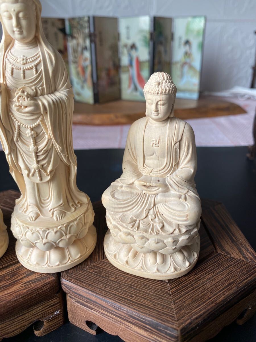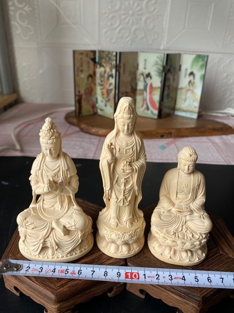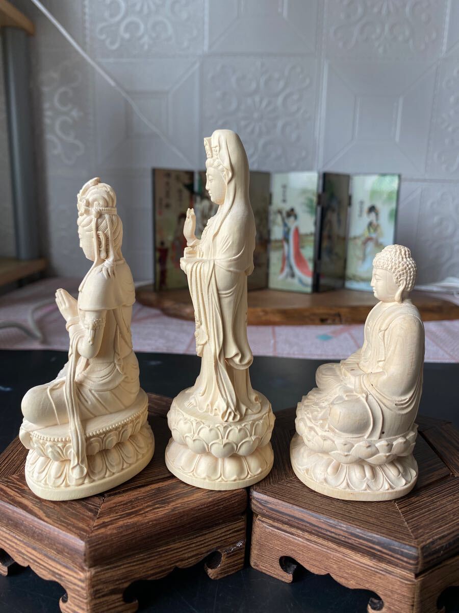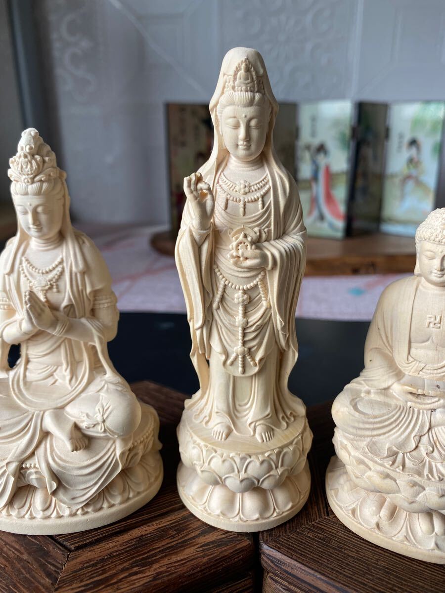 三尊立像 座像 観音菩薩 細密黄楊木彫 繊細彫刻 立像 柘植 ツゲ 観世音菩薩 観音様 お守り 仏教美術 ご本尊 縁起物