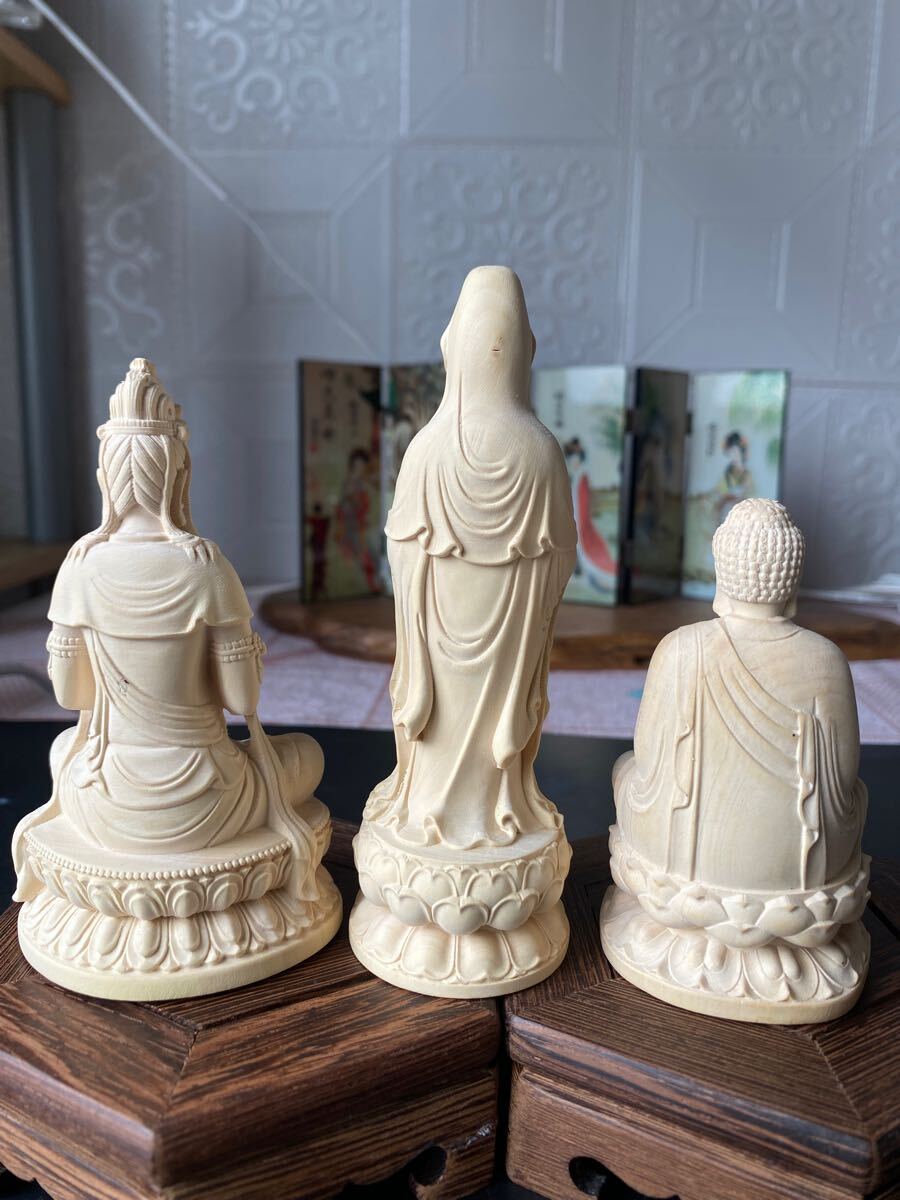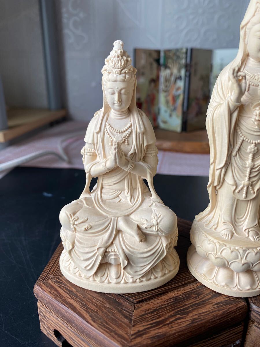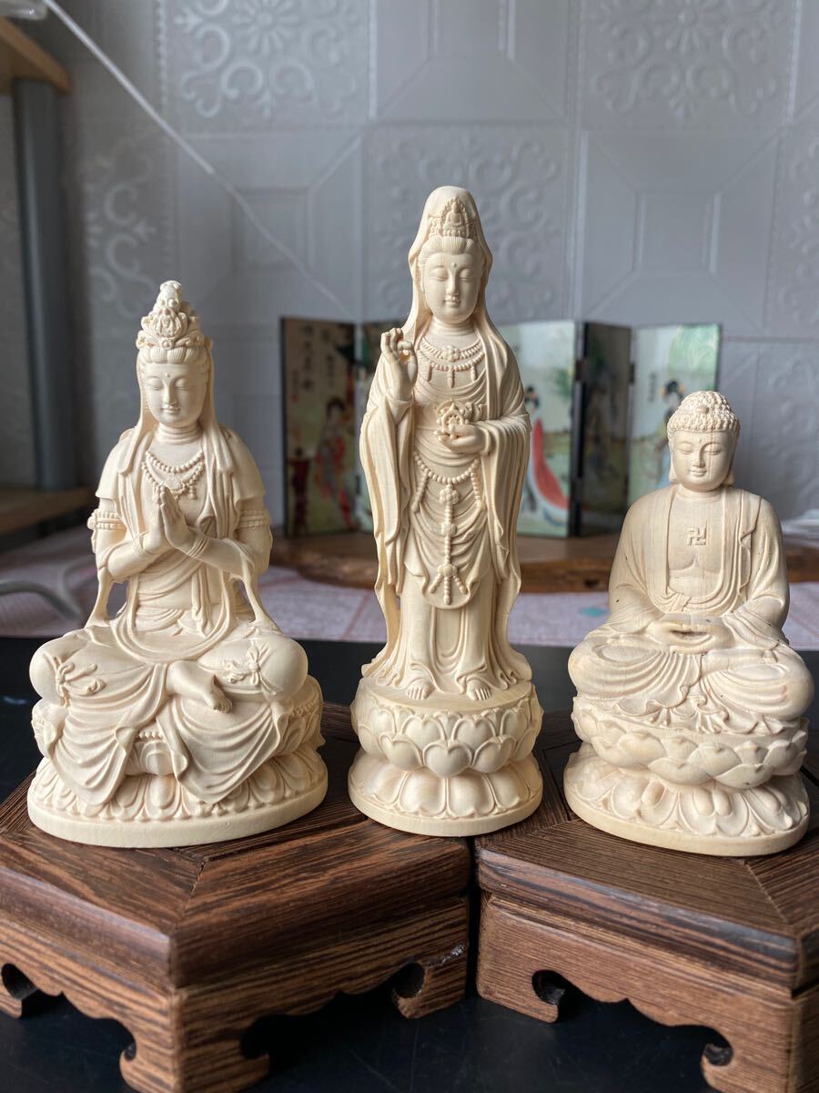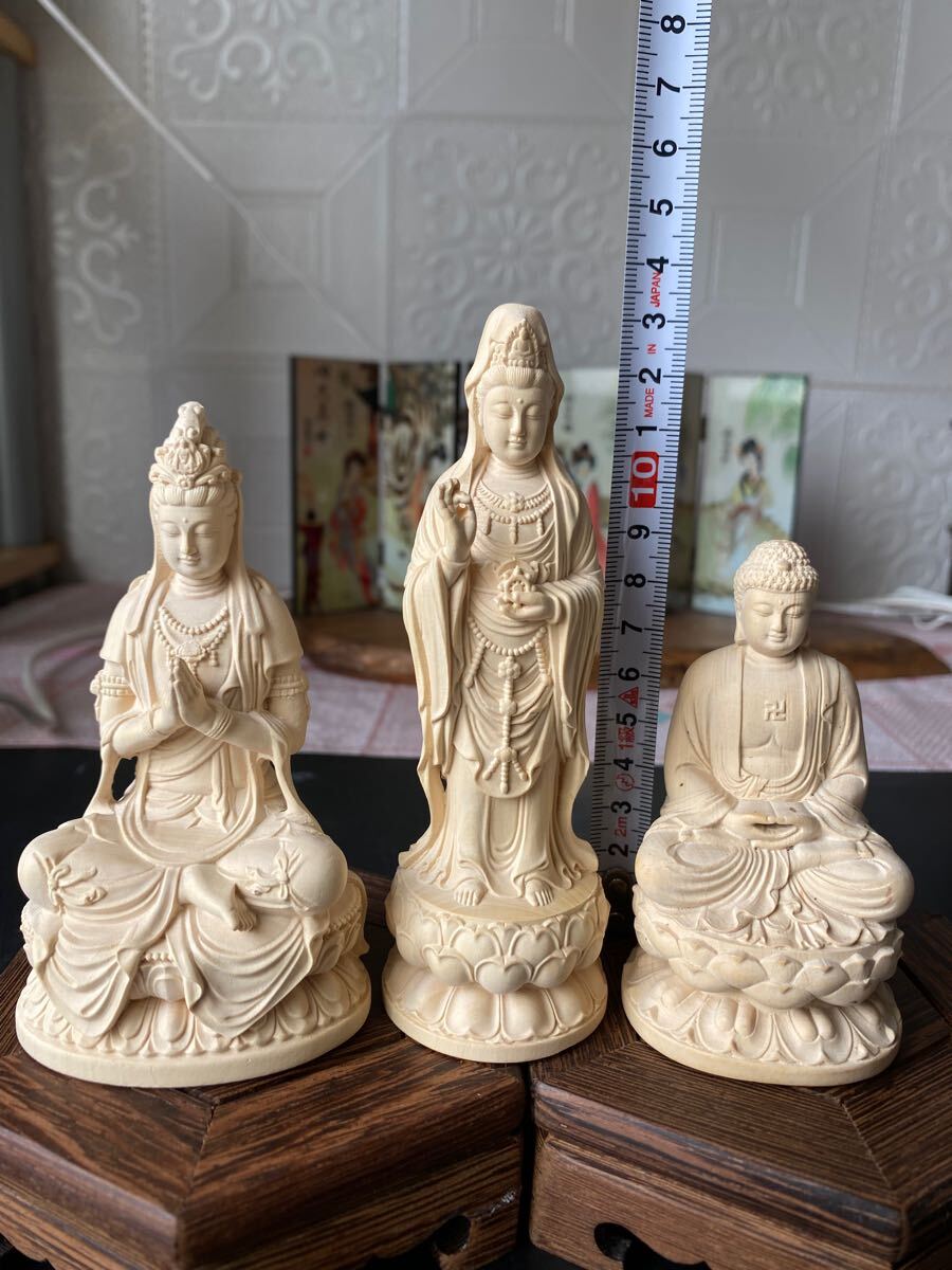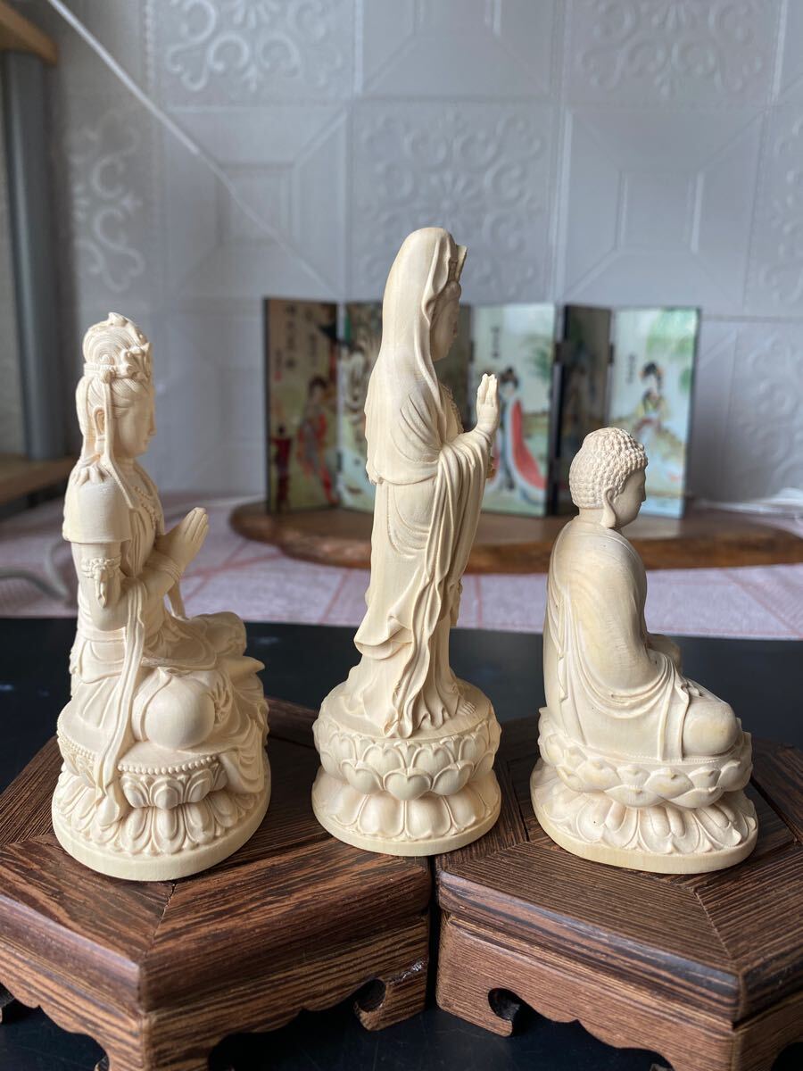三尊立像 座像 観音菩薩 細密黄楊木彫 繊細彫刻 立像 柘植 ツゲ 観世音菩薩 観音様 お守り 仏教美術 ご本尊 縁起物