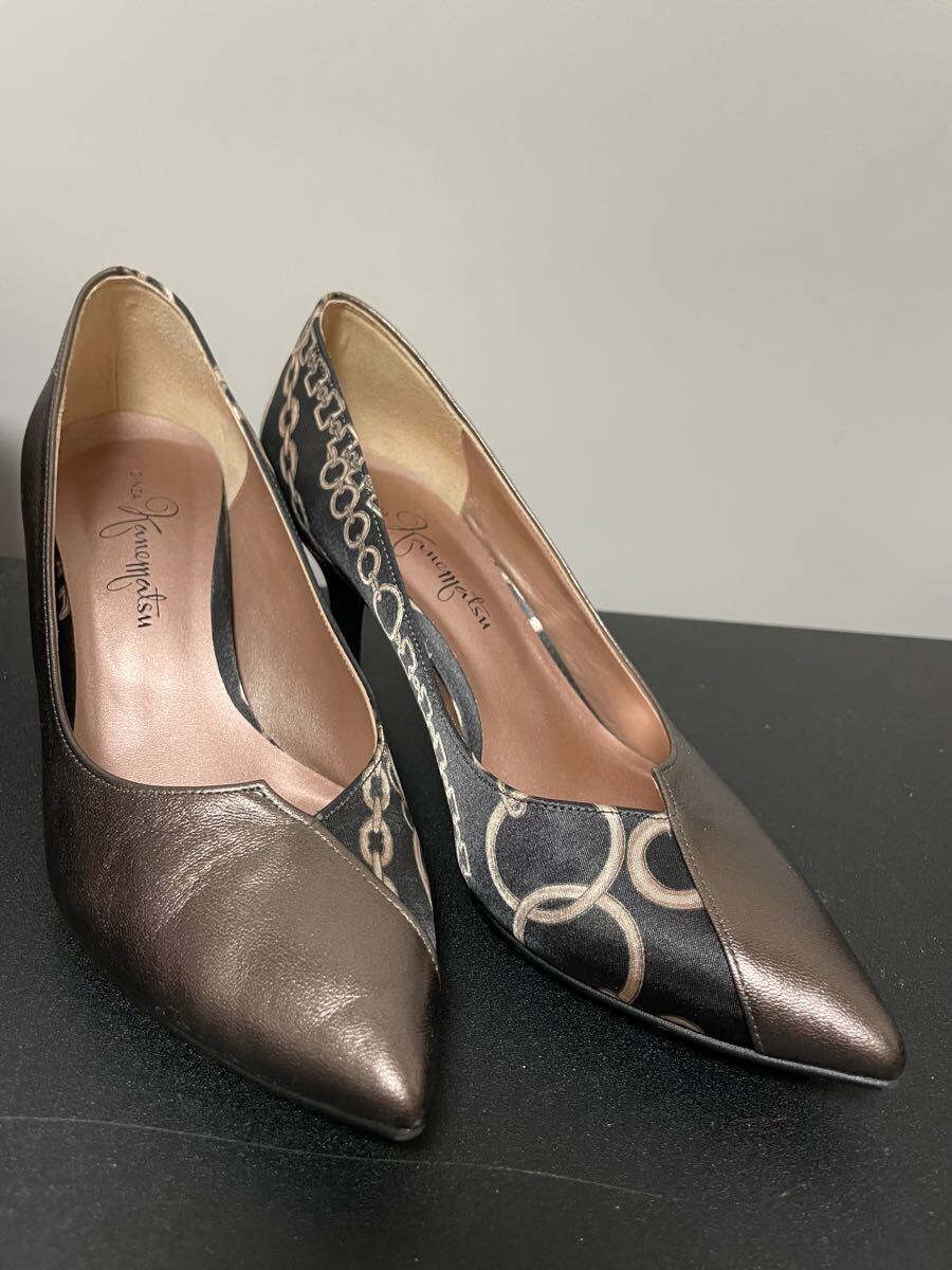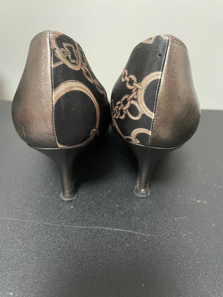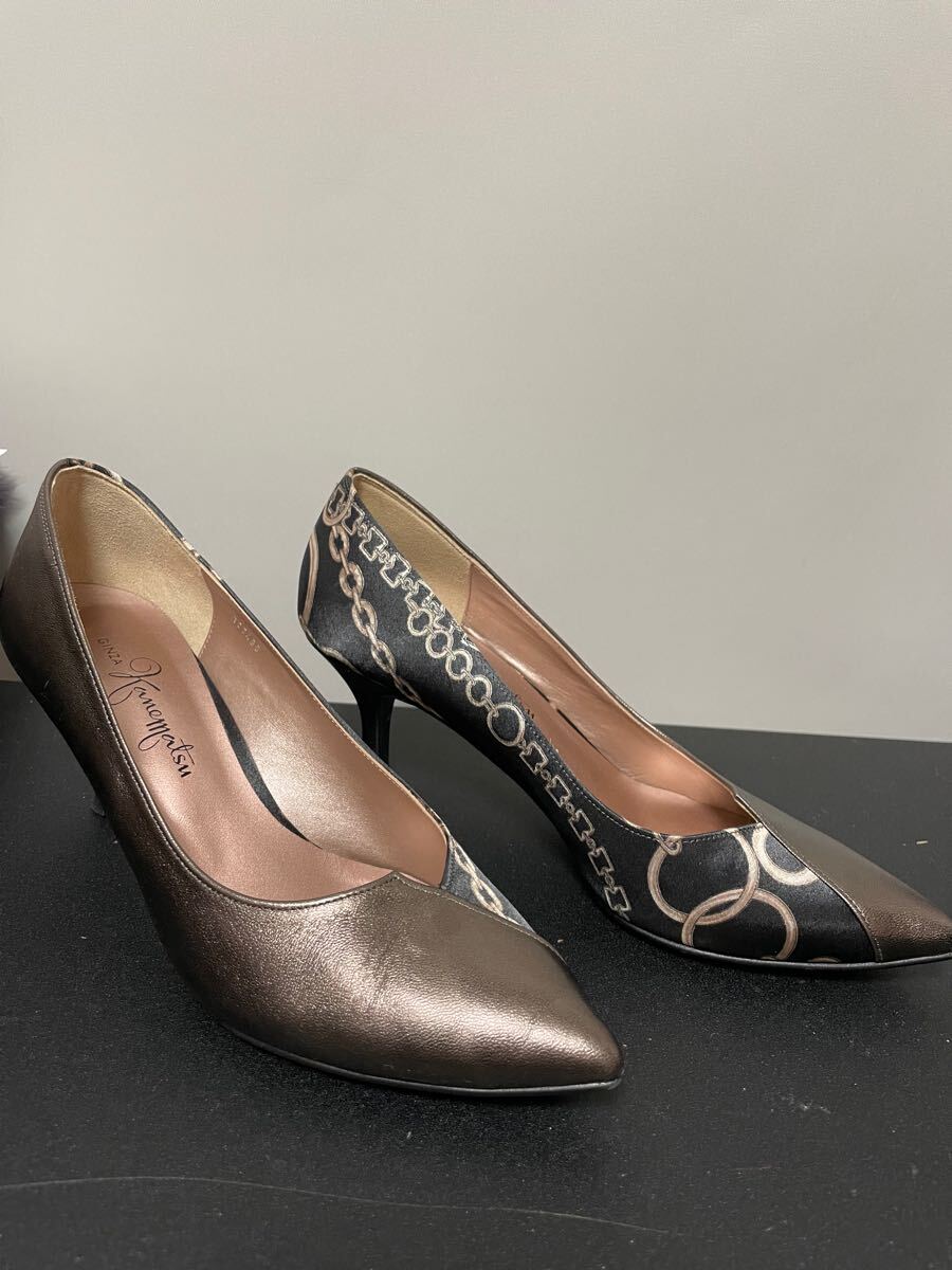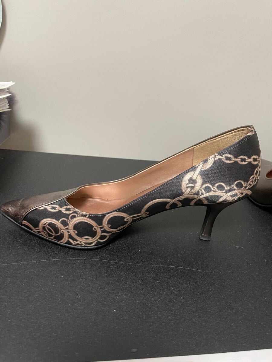 チェーンパターンが特徴的なブラウンとブラックのハイヒールパンプス。