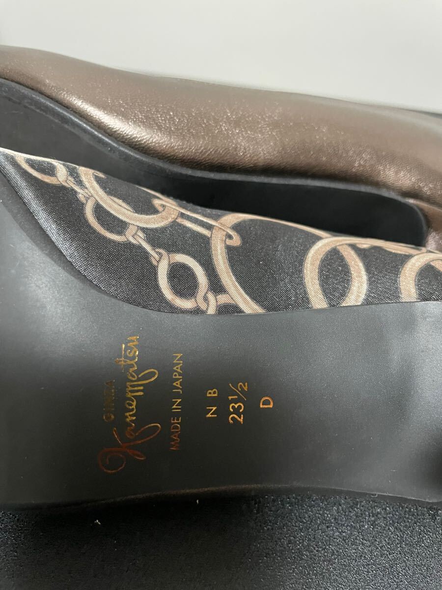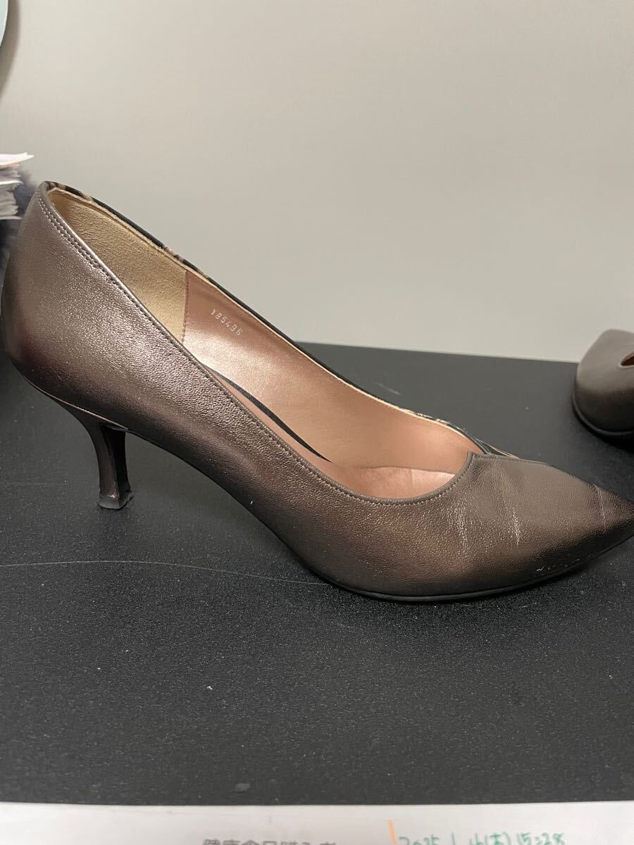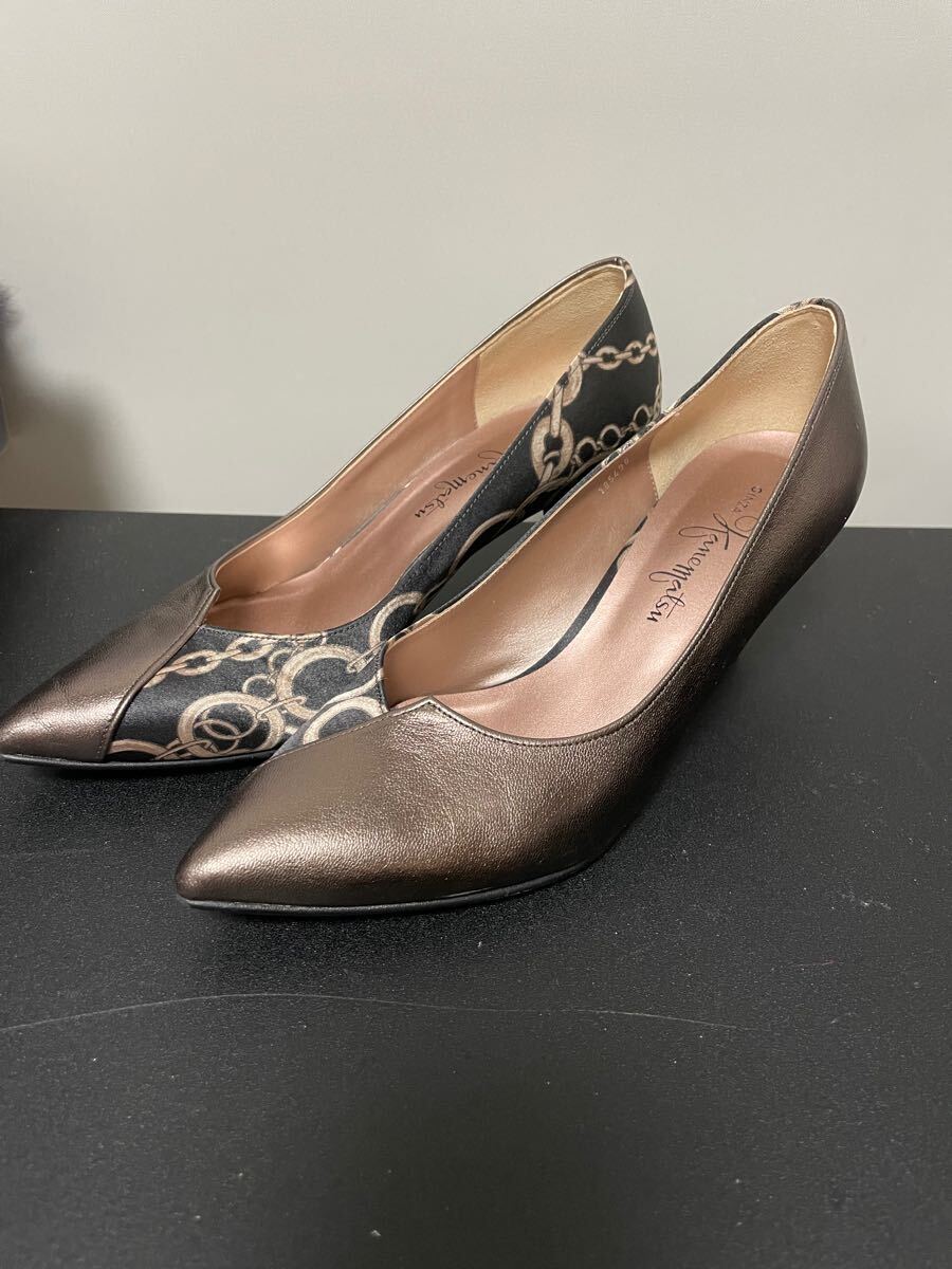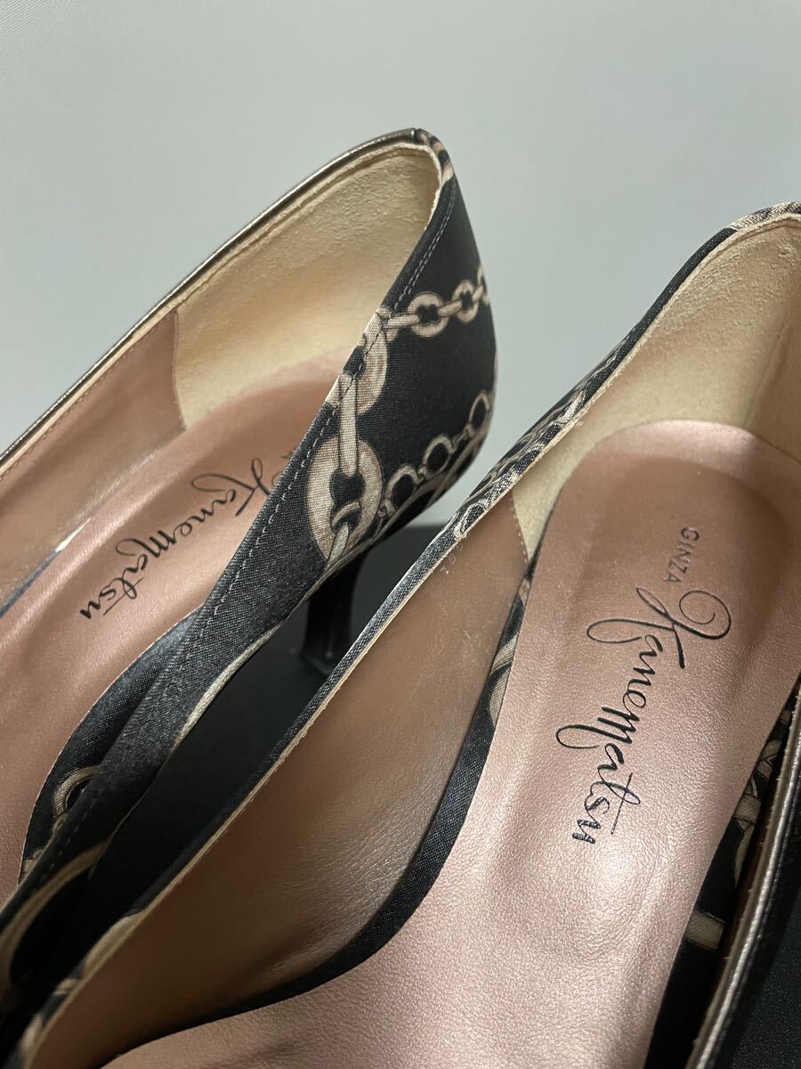 チェーンパターンが特徴的なブラウンとブラックのハイヒールパンプス。
