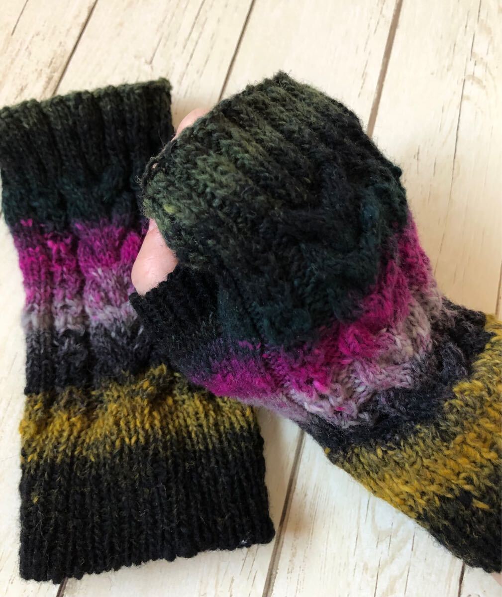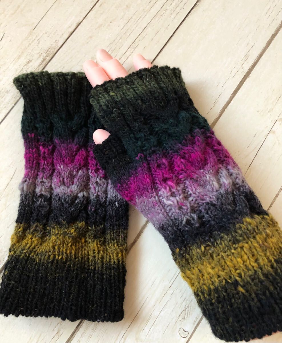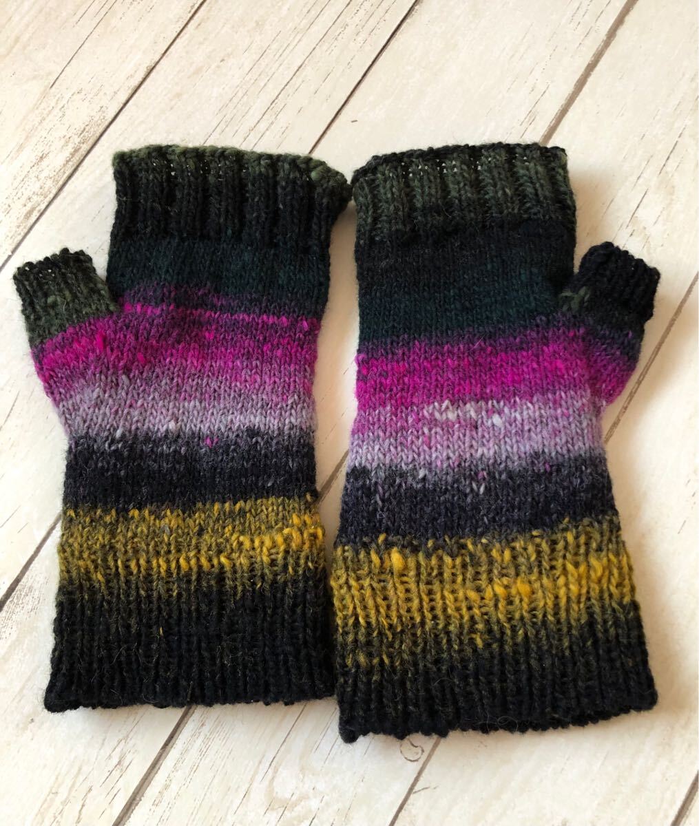 個性的で美しいグラデーションが特徴の野呂英作毛糸で編んだハンドウォーマーです。