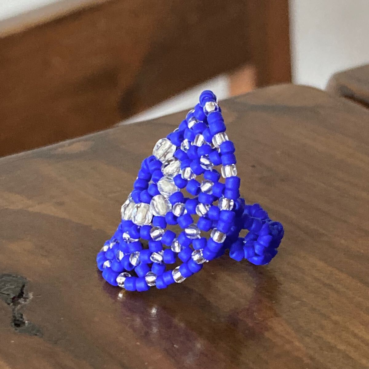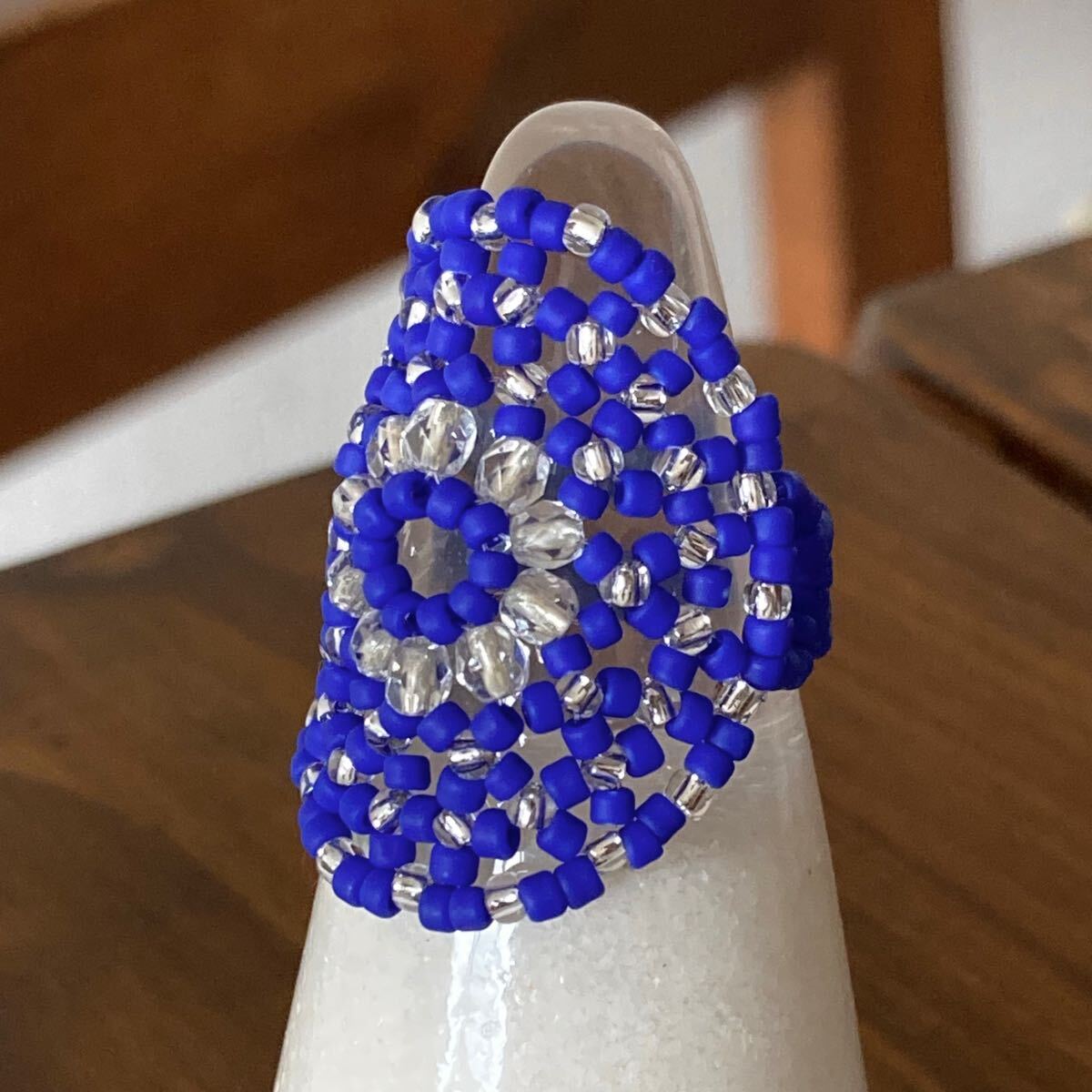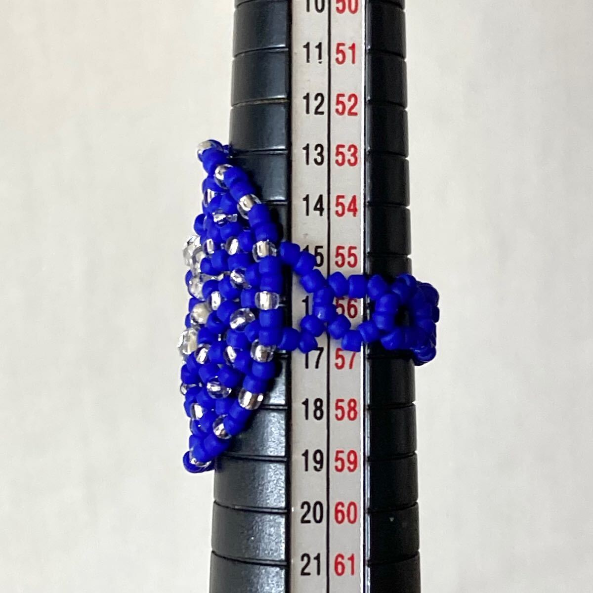 ビーズ リング 指輪 ハンドメイド 大きい丸型 マットブルー×クリアシルバー 15-17号です。