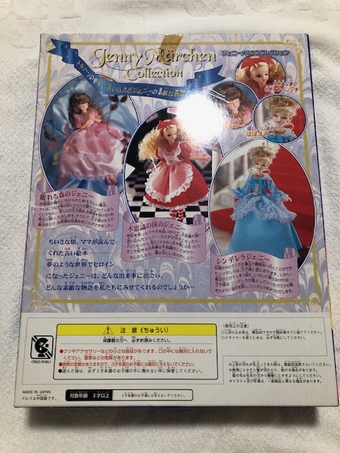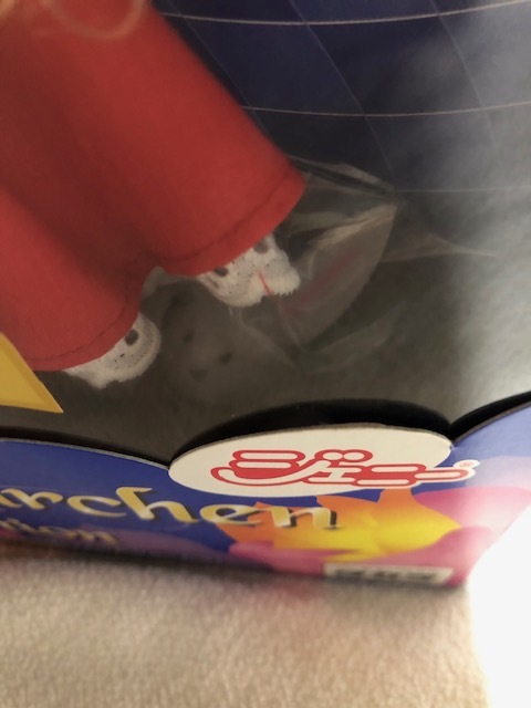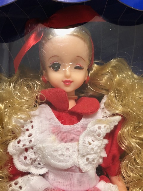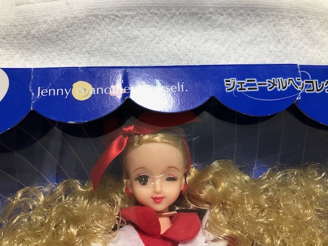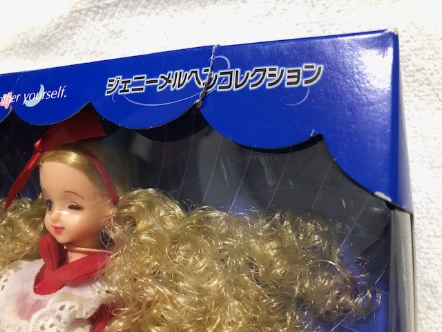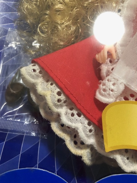 開封済みです。人形は台紙から外していません。洋服の白のレース部分が数か所茶色く汚れています。箱は、上部が2か所破れていて、透明カバーの上部が箱から外れています。箱にはキズや折れやへこみがあり、傷んでいます。足元にウサギのぬいぐるみが見えます。発送は大阪からゆうパック80サイズです。