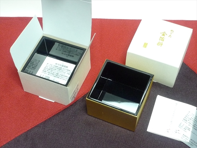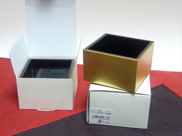 | めでた金箔枡「外側金箔、内側黒/箔一製・2個セット」日本製 未使用です。 品名:合成漆器 素材:ABS樹脂 ウレタン 本金箔 ・金色と黒の艶が大変きれいです。 大きさ及び容量(約) 7.8×7.8cm、高さ4.8cm 180ml ★発送は、レターパックプラスを予定しています。 | ||