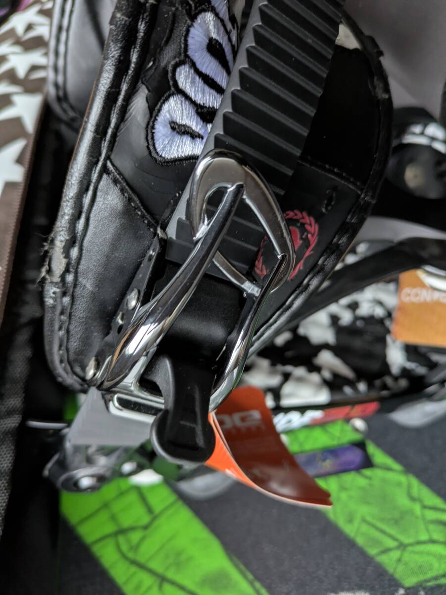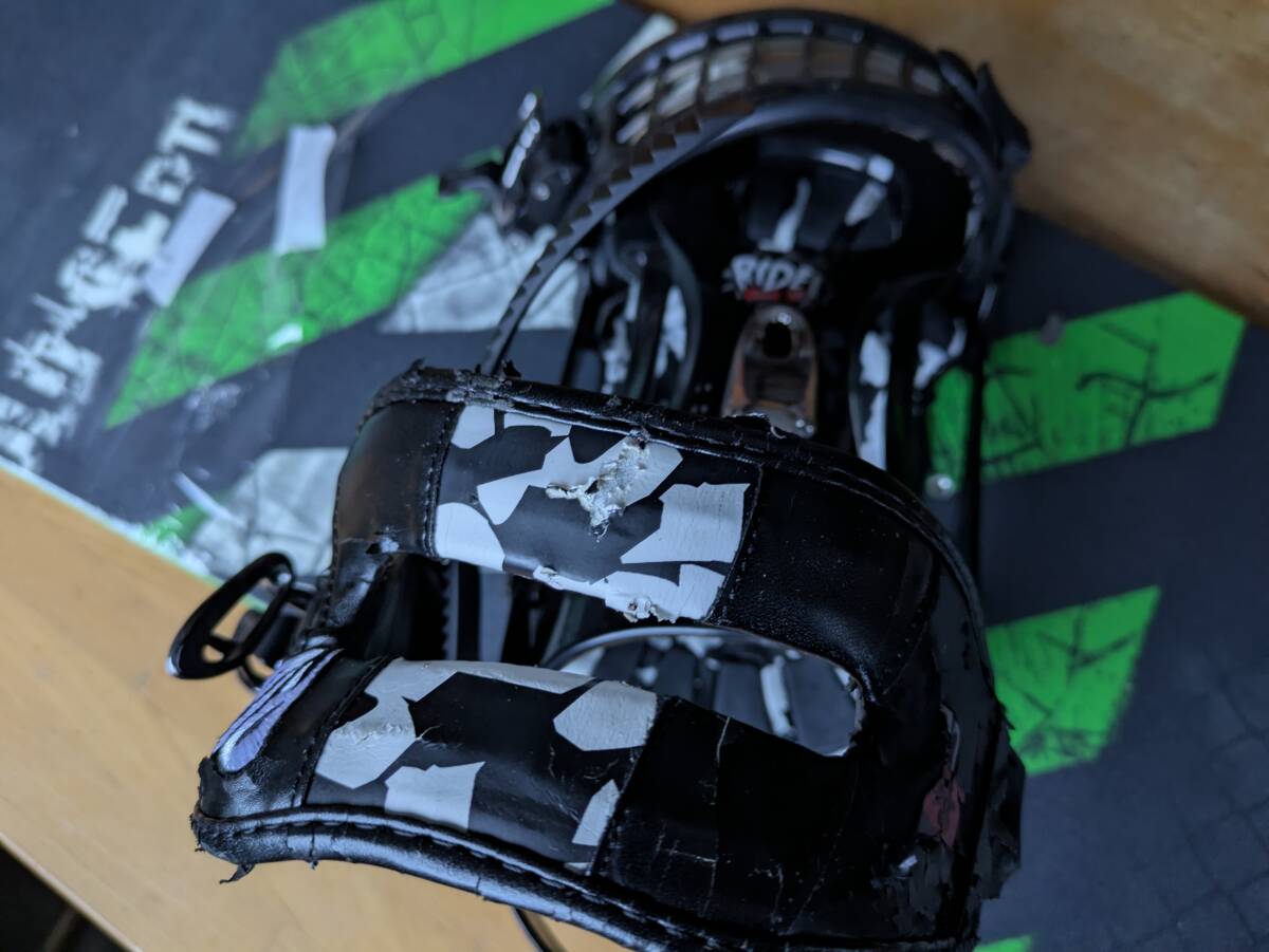 古いのでビンディングの合皮の表面がパリパリ剥がれがあります(写真)。