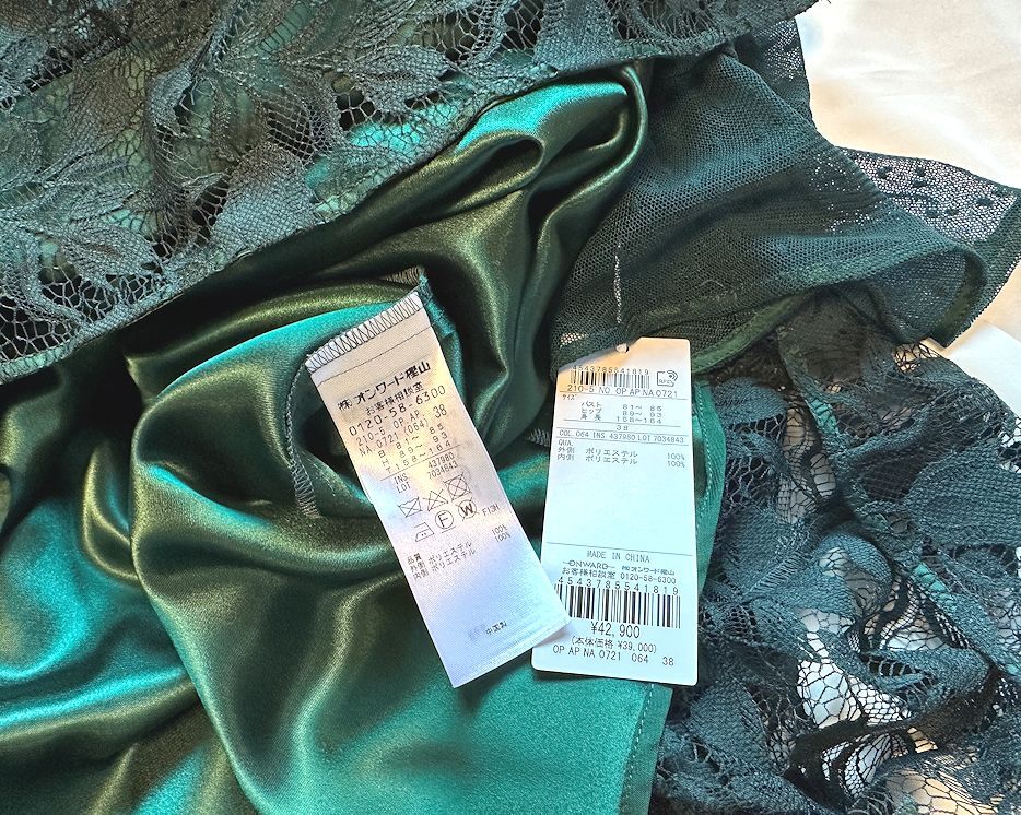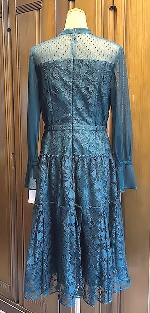 ◎華やかなフラワーレースに深みのあるブリティッシュグリーンの、品格の香るセレモニー・ドレスです。ウエスト下から二段切り替えたティアード・タイプのフレアになっており、腰回りのボリュームを抑えつつ、裾に向かう広がりが綺麗です。また、ややフレアになった袖口の上にはゴムが入っており、手を洗う際など袖を上げやすくなっています。23区ならではの細部に渡り計算された作りは、忙しい女性の味方として実用性も兼ね備えた仕上がりになっています。ウェディング、仕事関係、入学・卒業式など、色々な華やかなお席に活用しやすいと思います。いかがでしょう★