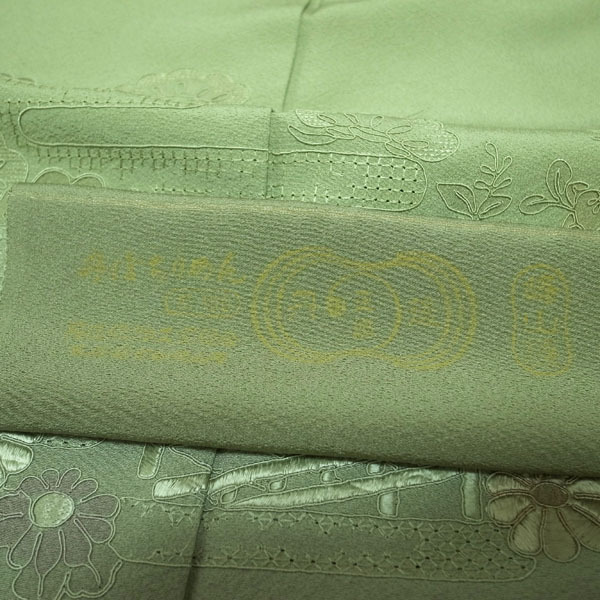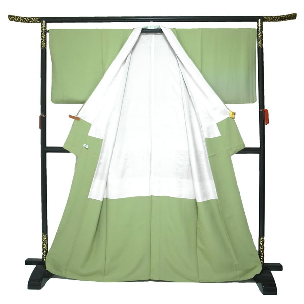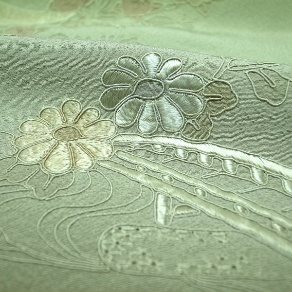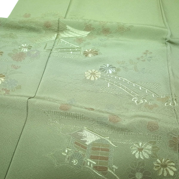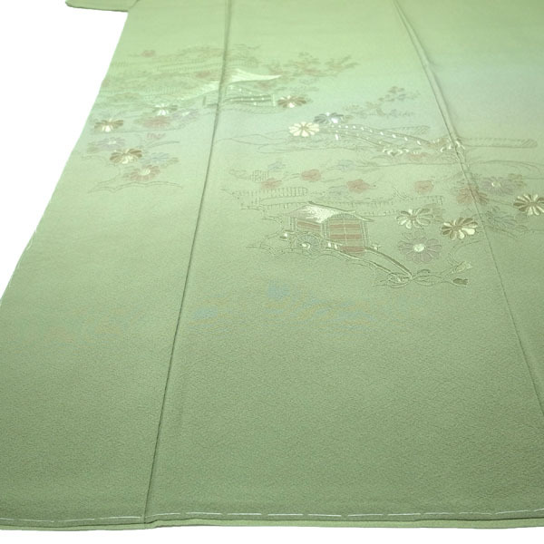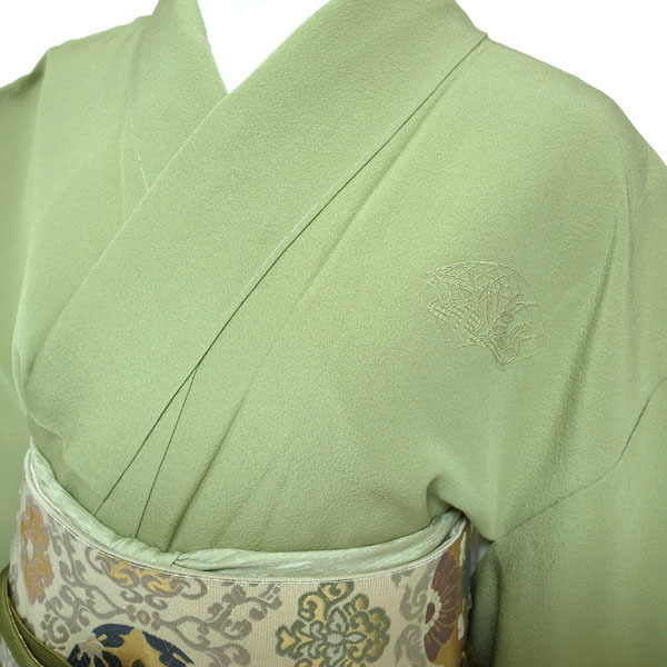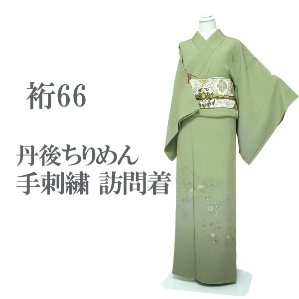訪問着 着物 袷 手刺繍 丹後ちりめん 縮緬 ちりめん 薄緑 緑 グリーン 菊 梅 松 橘 古典柄 花 お花 フォーマル 結婚式 お茶会 七五三 入卒式 正絹 絹 美品 きれい キレイ 綺麗 未使用品 未使用 春 秋 冬 なごみ 身丈164 裄66 Lサイズ 新古品 仕立て上がり品 sn1436