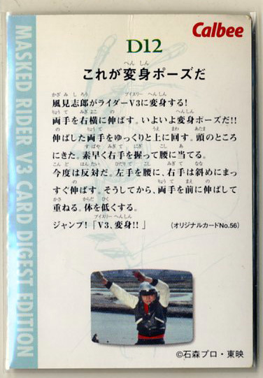 | ◆防水対策 厚紙補強 カルビー 仮面ライダーV3チップスカード(2004 復刻版) D12 これが変身ポーズだ トレカ 即決 | |