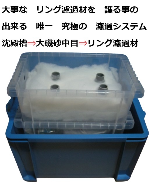 この様な 濾過システムでは リング濾過材は 直ぐに 汚れてしまい 本来の 生物濾過が