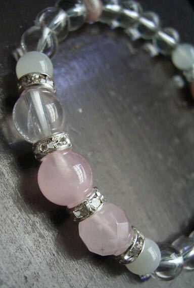 中央に3種のローズクォーツ、ディープローズクォーツ、カットのローズクォーツ、マダガスカル産の透明度の高いローズクォーツをロンデルをはさんであわせました。