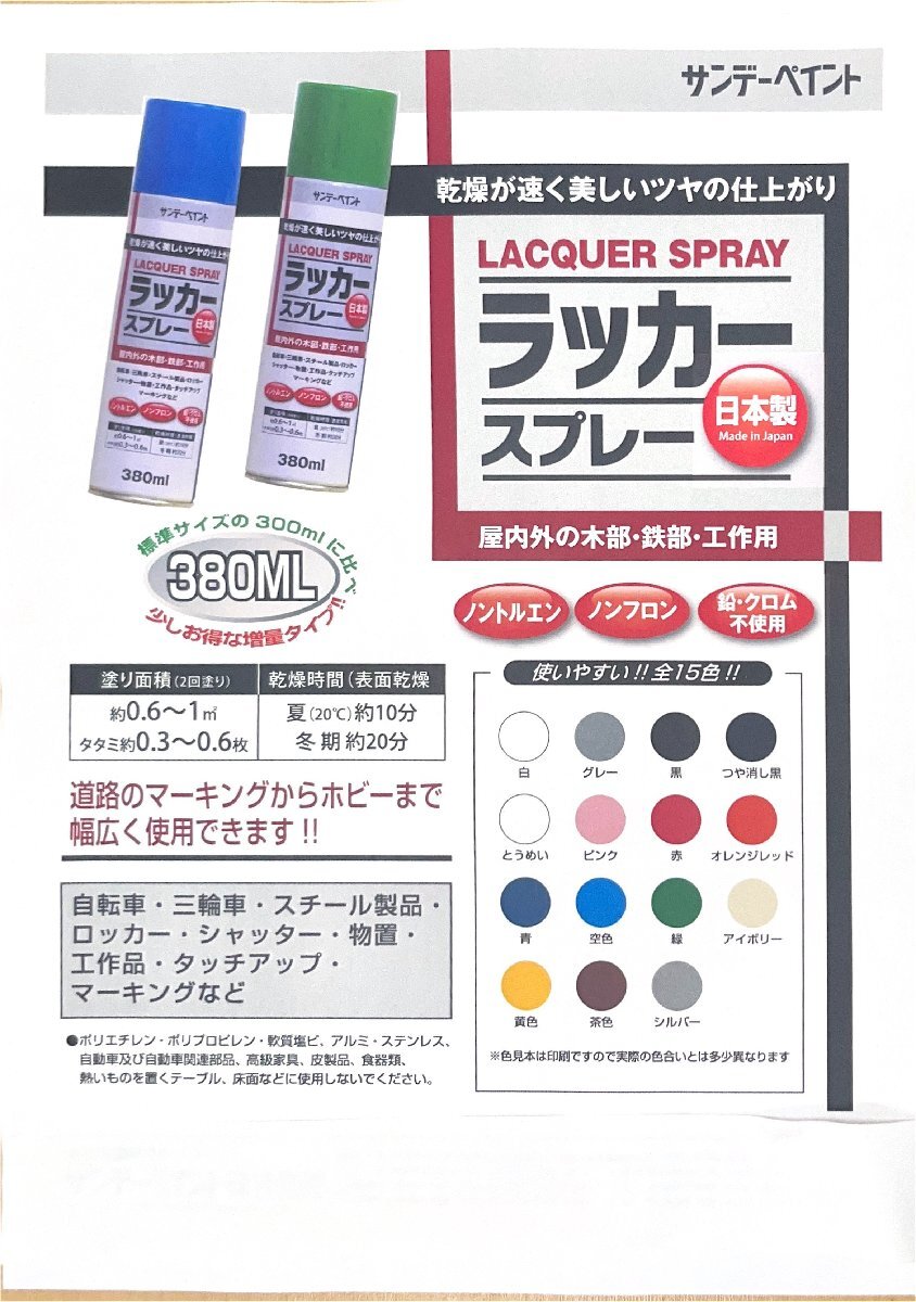アウトレット品 サンデーペイント ラッカースプレー 380ml 青(ブルー)2本セット 日本製のご紹介です。 ※開封前にかくはん玉の音が聞こえてから約30秒間振り動かし、使用中も時々振り動かしてください。 【塗り面積(2回塗り)】約0.6~1m2 (タタミ約0.3~0.6枚分) 【乾燥時間】表面乾燥:夏(20℃)…約10分 冬期…約20分 【用途】 屋内外の木部・鉄部・工作用 ・鉄部/自転車、三輪車、スチール製品、ロッカー、シャッター、物置、門扉、フェンス、農機具など ・屋内外木部/木製造作物、家具、建具など ・ホビー、工作品/木工品、模型、おもちゃ、手芸品など 【特長】 ・乾燥が早く美しいツヤの仕上がり ・フロンガスやトルエン、メタノール、鉛・クロム等の有害物質を使用しない安心の日本製スプレーです ★ノークレーム、ノーリターンでお願いします。 箱はキズ汚れ等ございます。 ★出品中の商品は、店頭でも販売しております。 店頭で売れた場合には期日に関わらずオークションを早期終了させていだきます (ご入札があった商品は直ちに店頭からお下げしておりますが、稀に入れ違いで売れてしまう場合もございます。ご了承くださいませ) 当社のオークションは返品・交換・キャンセル等は一切お断りさせて頂いております。充分ご検討の上ご入札下さいませ。 | |