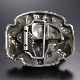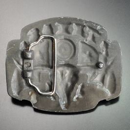長い大きな角を持ったテキサスロングホーンが中央に大きくは位置されたベルトバックルです。頭蓋骨の浮彫は本物の牛を再現させるような立体感があります。