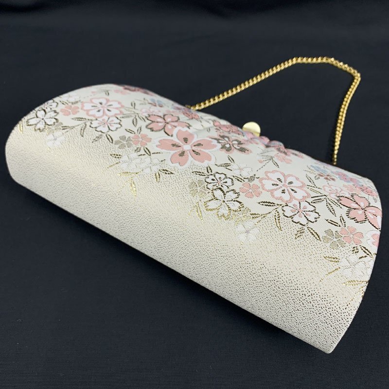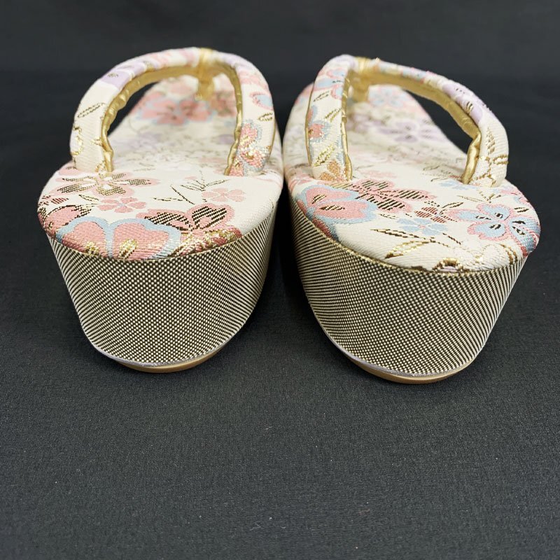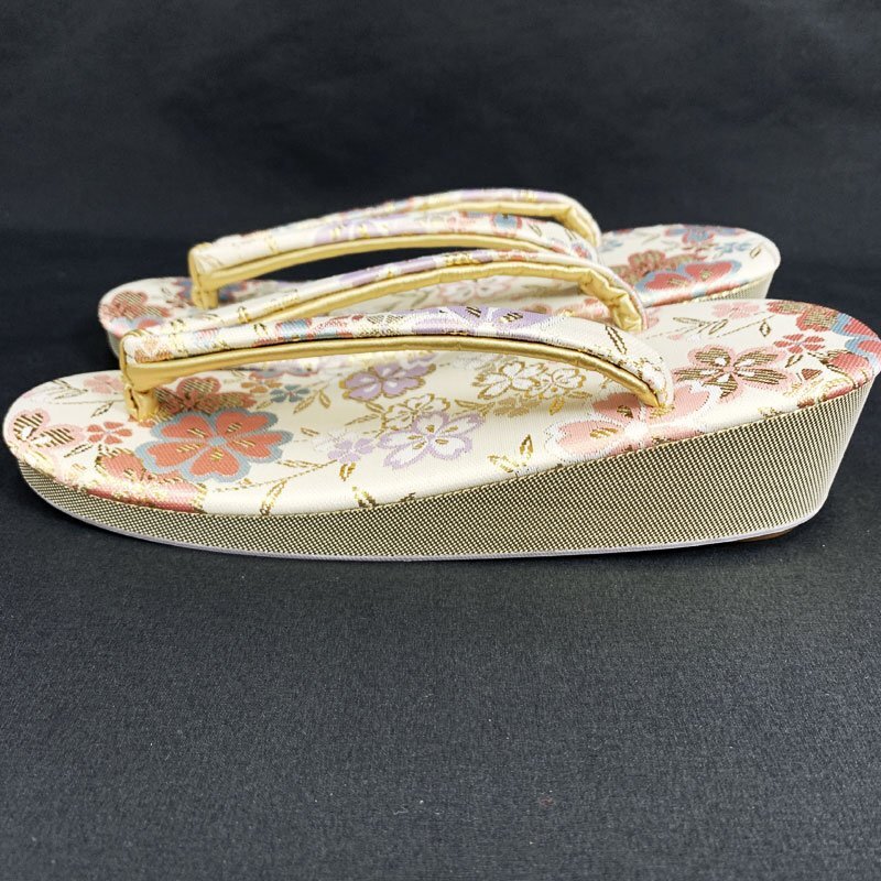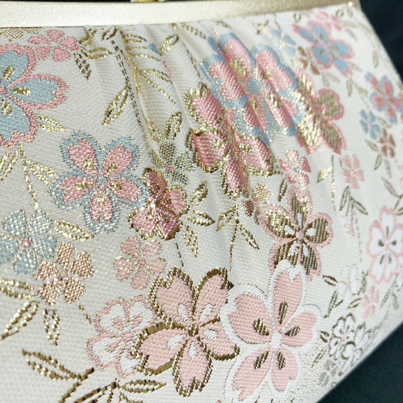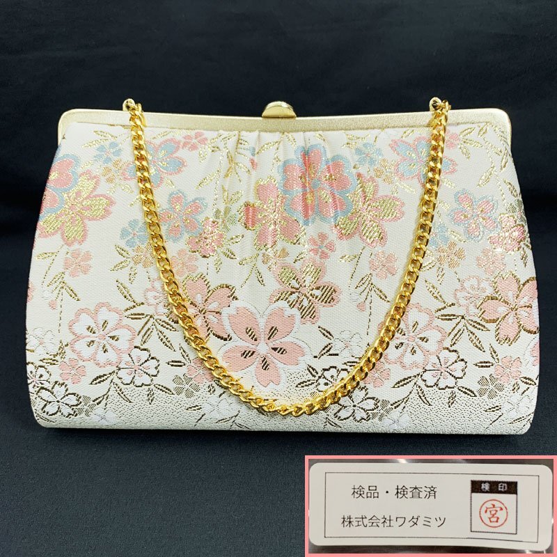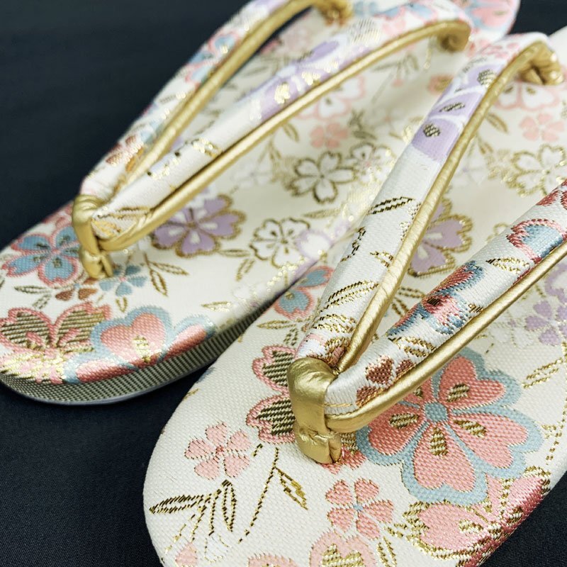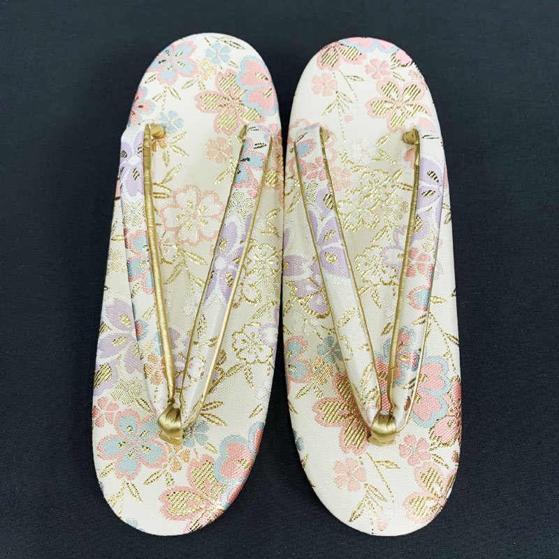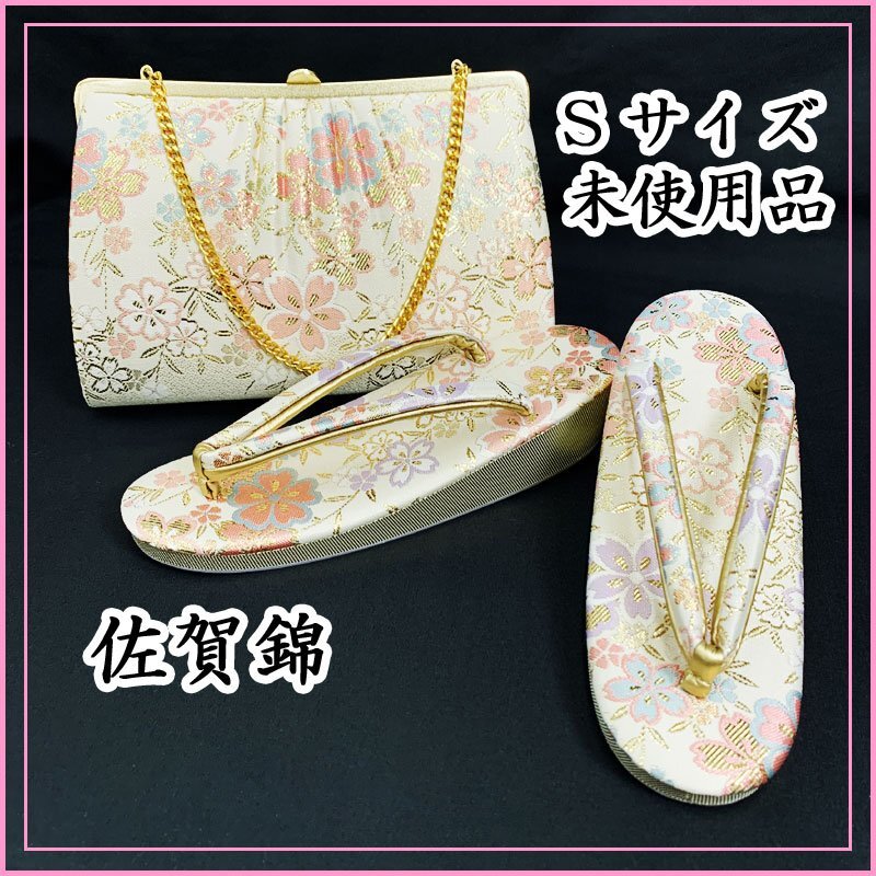 | ☆草履バッグセット Sサイズ 2way 佐賀錦 桜 オフホワイト ゴールド☆美品 (No.fio) オフホワイト地に桜模様が散りばめられた佐賀錦の草履バッグセットです。持ち手のチェーンが中にしまえる仕様になっていますので、クラッチバッグとしてもお使いいただけます。草履は一枚芯のSサイズです。成人式はもちろん、結婚式などの式典や十三参りにもおすすめです。 特に目立つようなシミ・ダメージもなく美品です。 【素材】正絹 【色】オフホワイト、ゴールド *モニターによって色味は実際と異なる場合がございます。 【サイズ】S 実寸 全長22cm、最大幅 7cm、かかと高さ4.5cm *素人採寸のため、多少の誤差はご容赦ください。 草履はかかとが台の端から2cmほど出ている姿が美しいとされ、着物の裾を踏まずにお履きいただけます。かかとを納めて履きたい場合はワンサイズ上のものをお選びください。 | |