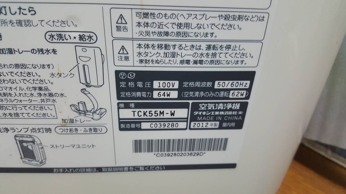 【家電】 DAIKIN ダイキン 加湿空気清浄機 TCK55M-W (1か所破損あり) 動作確認済み (No.2)