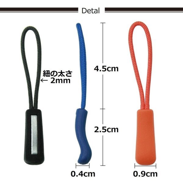 ・ジッパー端のリングに結ぶだけの取り付け簡単で、ほとんどのファスナーに付けられます。壊れてしまったタブの修理やつかみにくいタブに取り付ければ、使い勝手のよいチャックにリニューアルできます。
