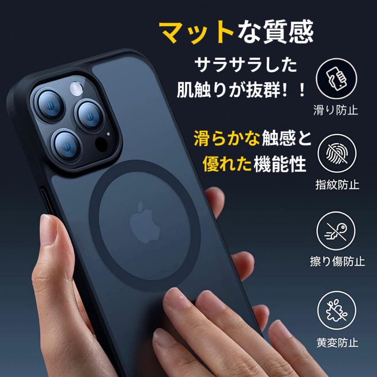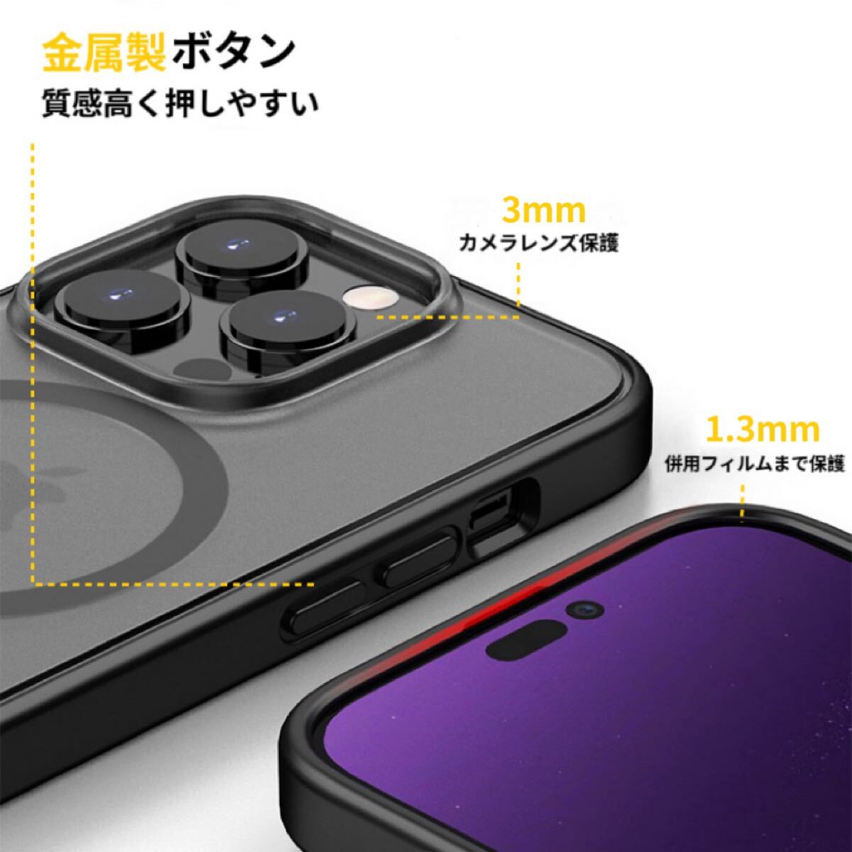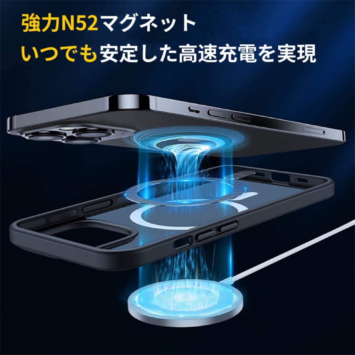 強力なN52マグネットを搭載し、いつでも安定した高速充電は可能です。MagSafe対応です。優れた耐衝撃性で、衝撃を受けやすい縁・四角はシリコンで作られ、カメラレンズと保護フィルムより高く、360°保護を実現したとても頑丈なiPhone保護ケースです。