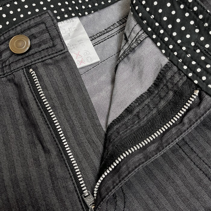 | 商品状態・ディテールなど | (※実測寸法など、多少の誤差はご容赦下さい。) (※商品は衣類の場合は全て畳んで保管しており、服飾雑貨も靴以外は必要に応じ畳んで保管しております。保管や梱包による畳み皺などはご了承下さい。) ●気になったダメージの場所と種類: ・所々:- ・全体:- ・フロントポケット:- ・バックポケット:- ・ヒップ:- ・腿:- ・膝:- ・脛:- ・裾:- ・裏地:- ・内側:- ●その他ディテール:ジップフライ、左ももにポケット、ウエストにドット柄の裏地付き ●付属品など:- ●その他:- |