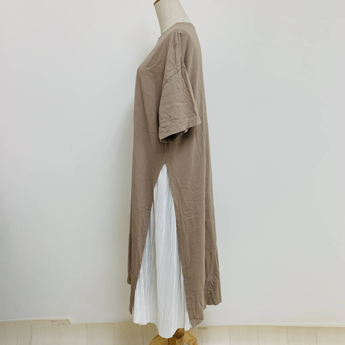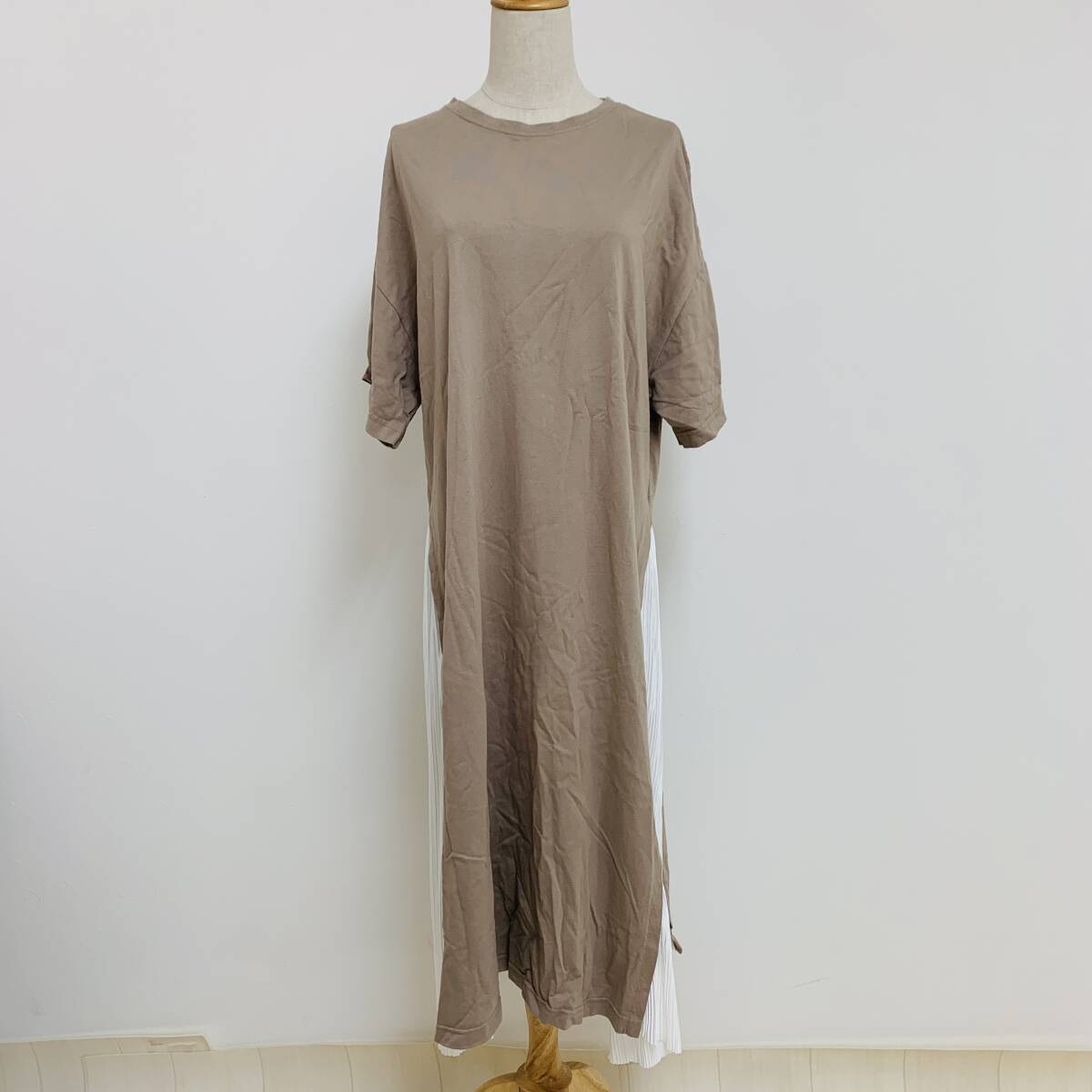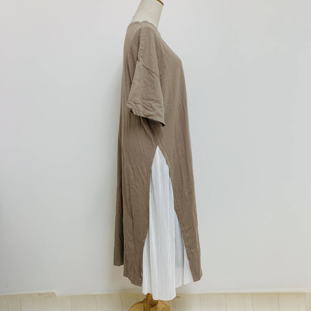 YH2538 RUDE GARRET レディース 半袖 ワンピース ロング丈 プリーツ 丸首 モカ 茶 Mサイズ 重ね着風 カジュアルスタイル 万能 USED 古着