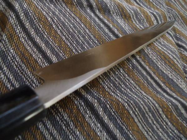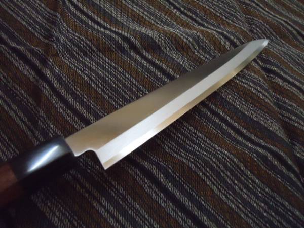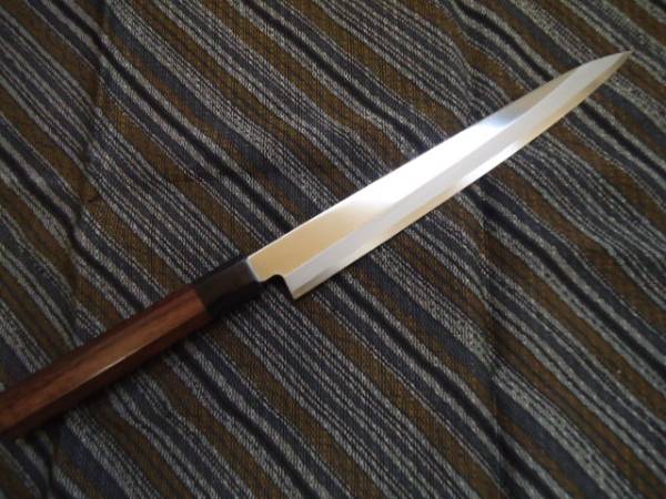 | ご面倒でも必ず注意事項等お読みの上、ご入札下さい。 入札・落札後のお申し出は承れません。 右利き用片刃 本格刺身包丁 安来白1号鋼 紫檀八角 柄付き(特別仕様) サイズ 全長410 mm 刃渡270 mm 刃幅 35 mm 刃厚 3 mm 重量198 g | |