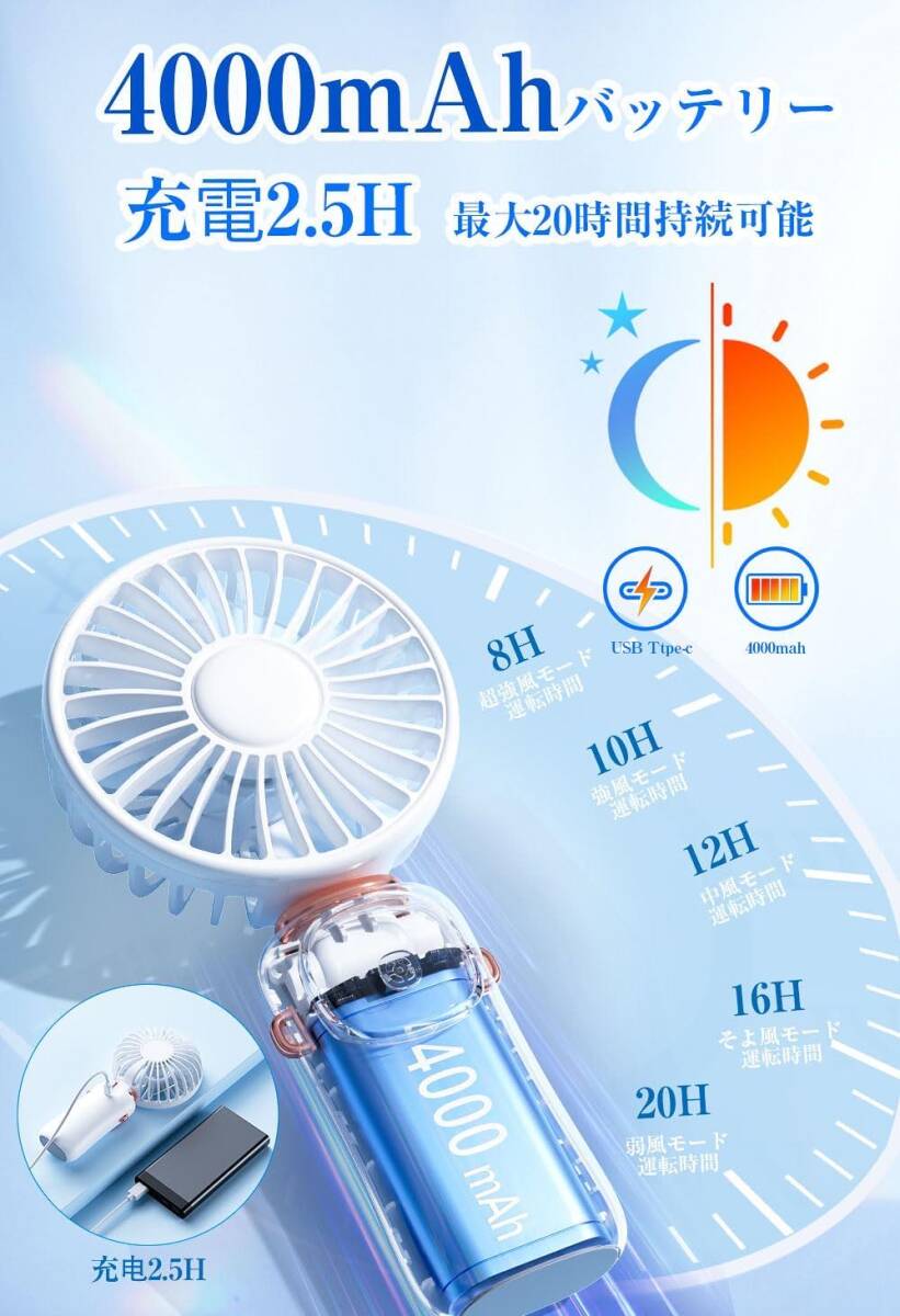 【20時間連続使用】ハンディファンのバッテリーは4000mAhの超大容量です。充電時間は2.5時間だけで、20時間連続使用は可能!外出先でのバッテリー切れを心配せず使えますし、こまめに充電する手間も省けます。