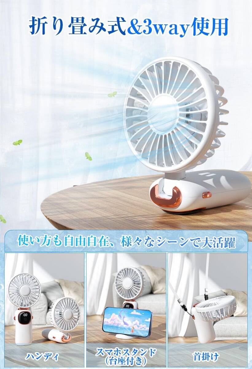【折り畳み式&3way使用】92°角度調整が可能です。台座に置いてスマホスタンドになり、動画を見ながら風が吹き、猛暑日にも快適。手持ちと首掛けの両用設計で使い方も自由自在、散歩や花火大会、運動会やオフィスなど、様々なシーンで大活躍、夏日のプレゼント用にも最適です。