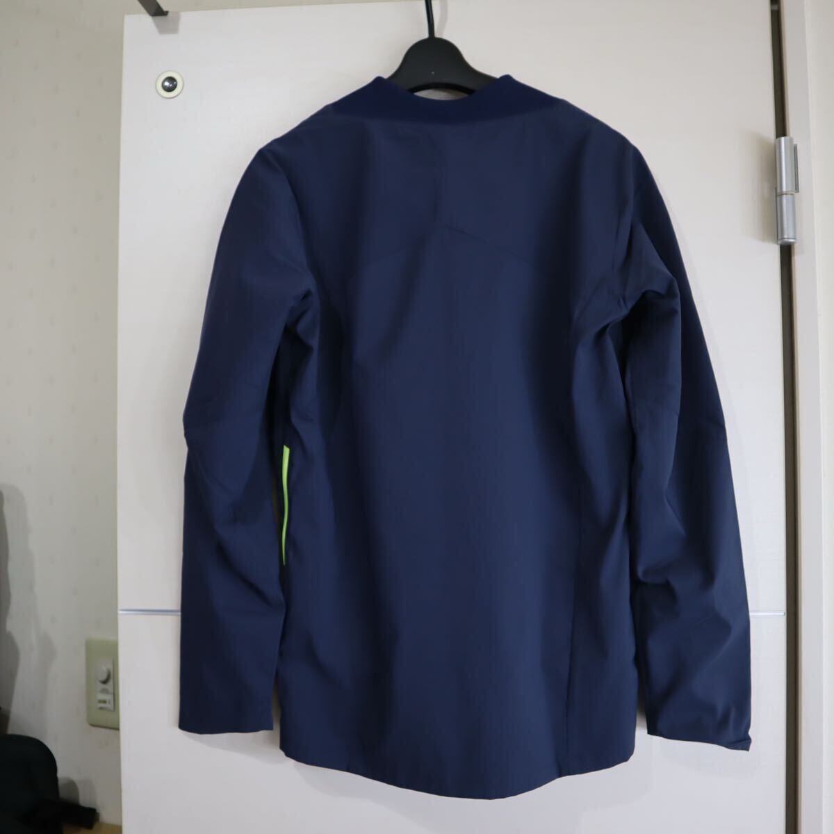 ●肩甲骨部分には織物生地の特性を生かし斜め裁断(バイアス)を施すことで、身体の動きに馴染む伸縮効果を発揮する独自の立体パターン「バイヤシステム」を採用。はっ水・ストレッチ織物素材「ストレッチウーブン」を採用。着脱のしやすい左脇ファスナー仕様。総裏メッシュ仕様。角度によって見え方の変わるマジョーラカラー転写ロゴを採用