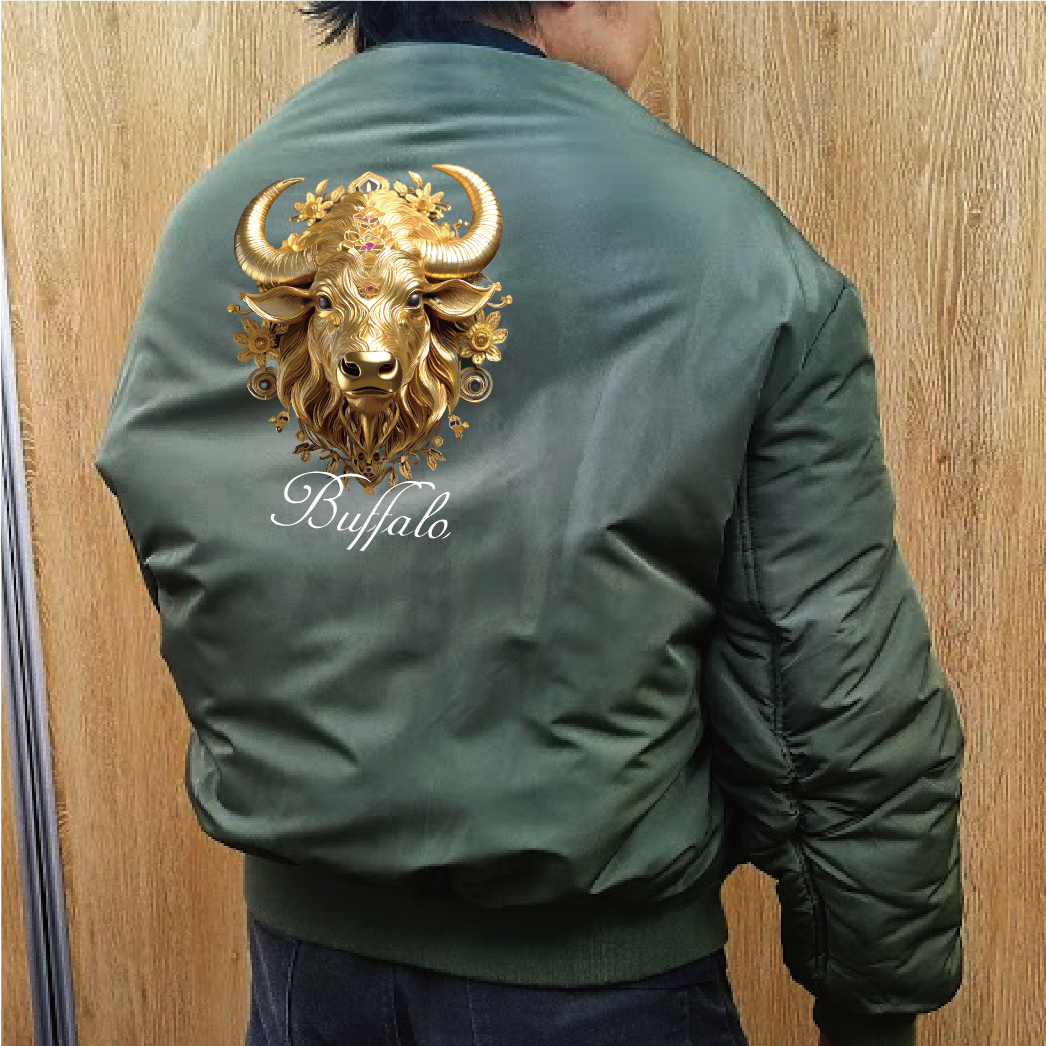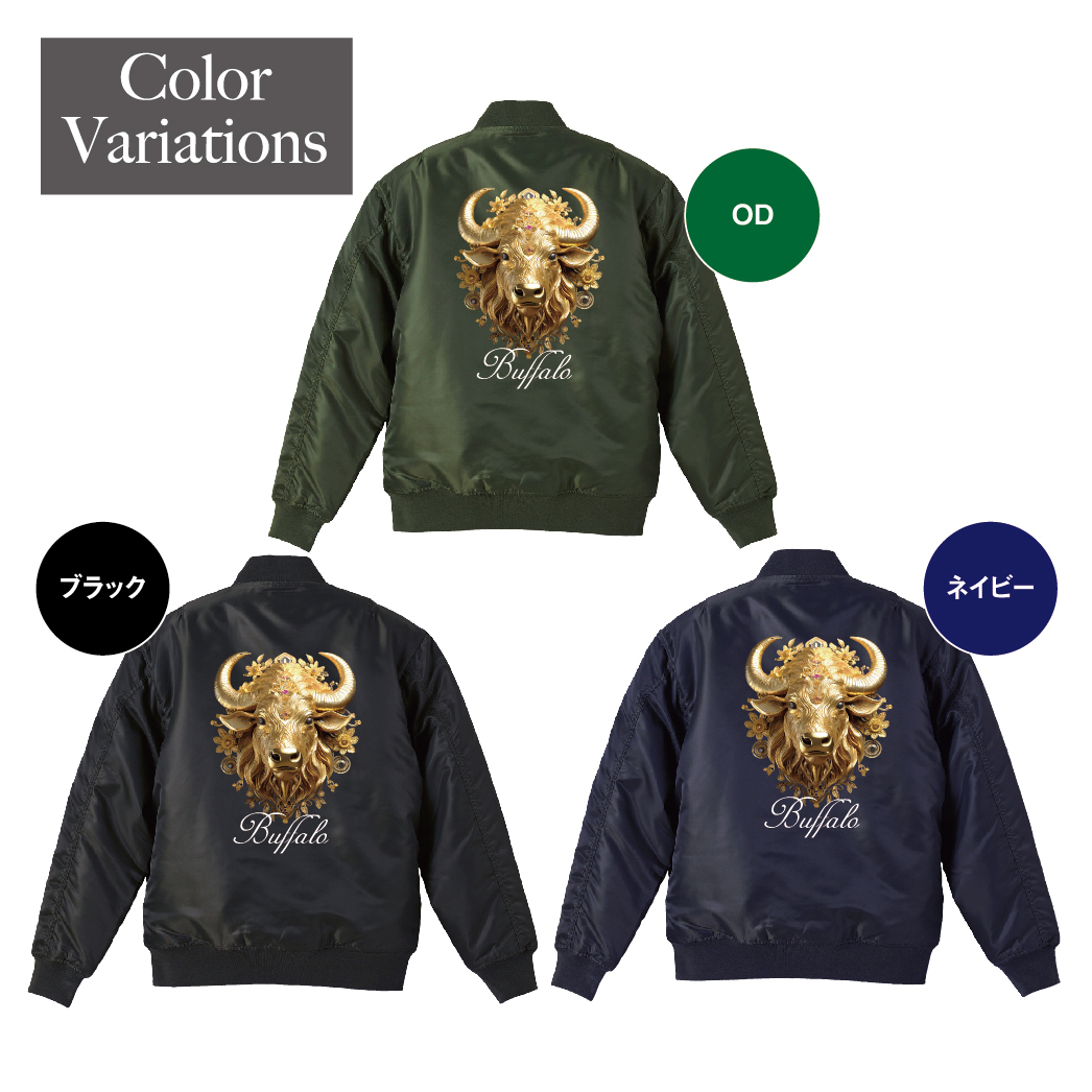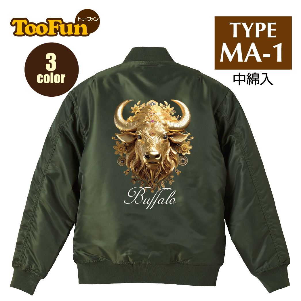 タイプMA-1ジャケットは、金の闘牛の刺繍のような風合いが特徴のオリジナルデザインです。このジャケットは、背中に豪華なバッファローの装飾が施されており、存在感抜群です。中綿入りで、寒い季節でも暖かく過ごせます。3色展開で、お好みの色を選べるのも魅力の一つです。カジュアルなスタイルから、少し個性的なファッションまで幅広く対応できるこのジャケットは、他にはない特別な一着です。日常のコーディネートに取り入れるだけで、ワンランク上のおしゃれを楽しめます。