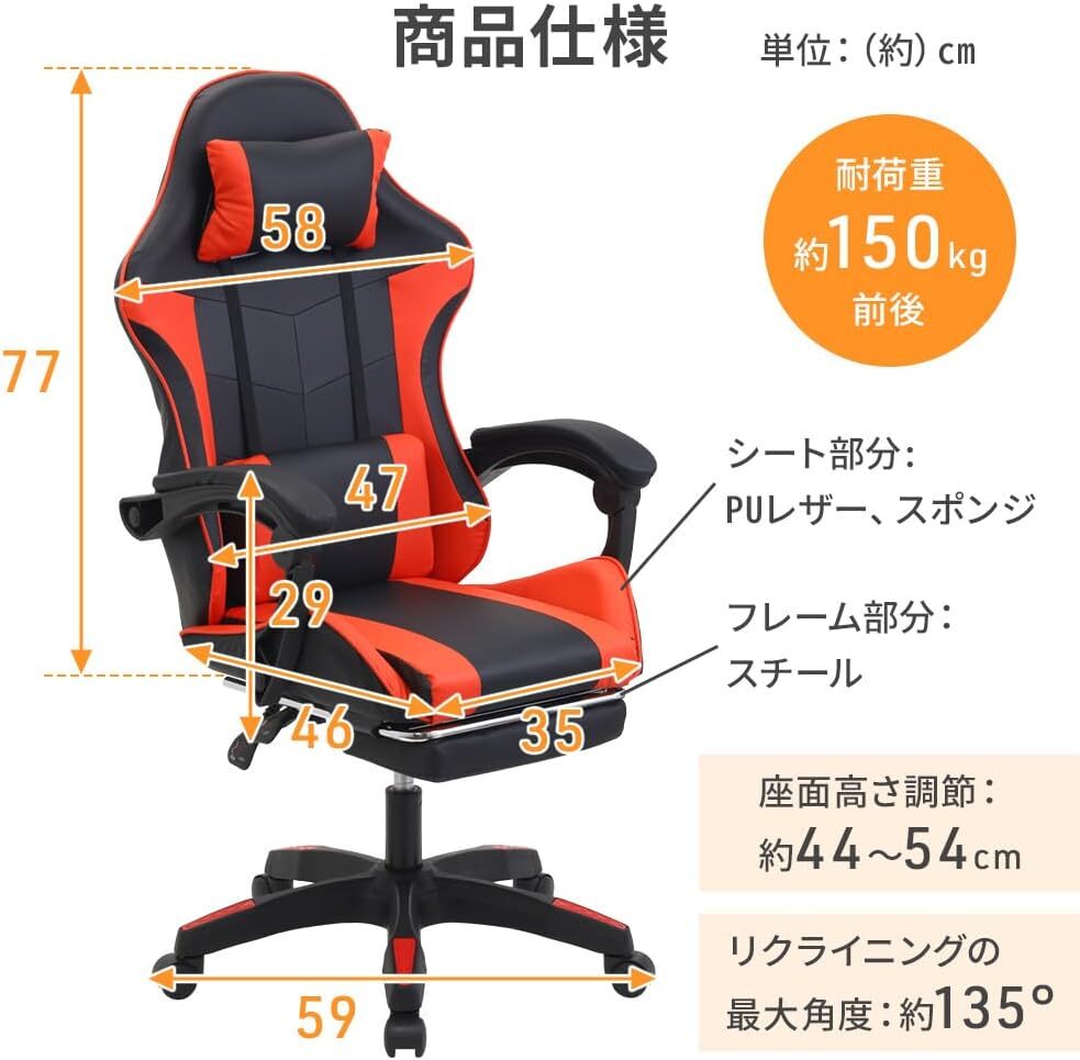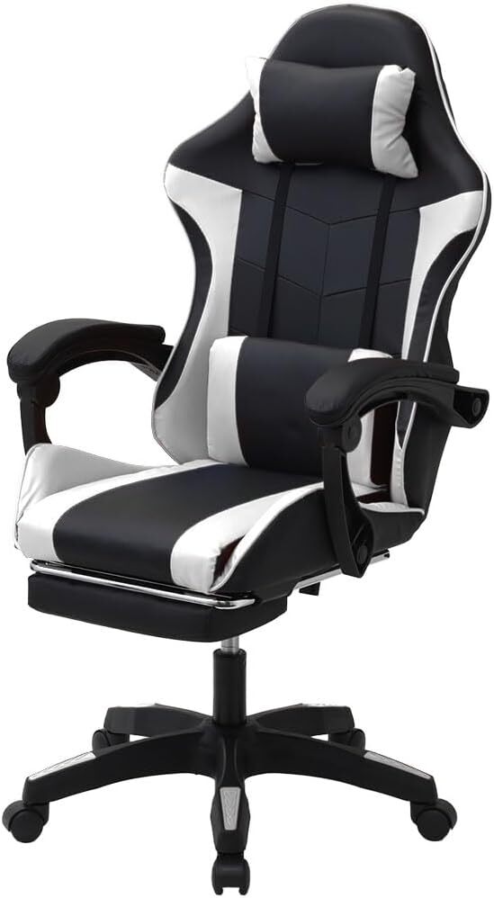 ゲーミングチェア 白 オフィスチェア デスクチェア ひじ掛け付き PUレザー クッション オットマン付き ブラック×ホワイト