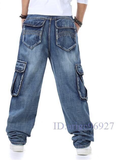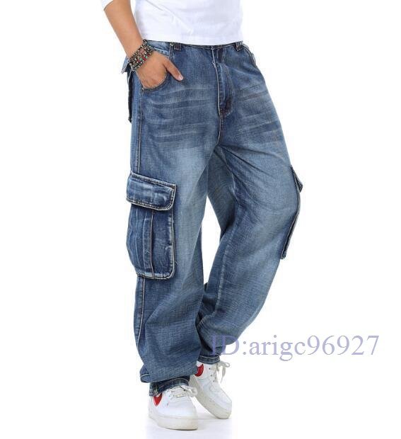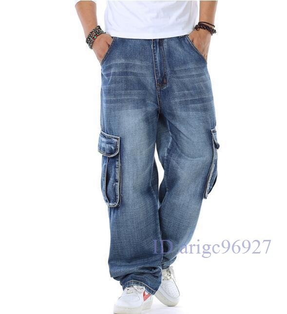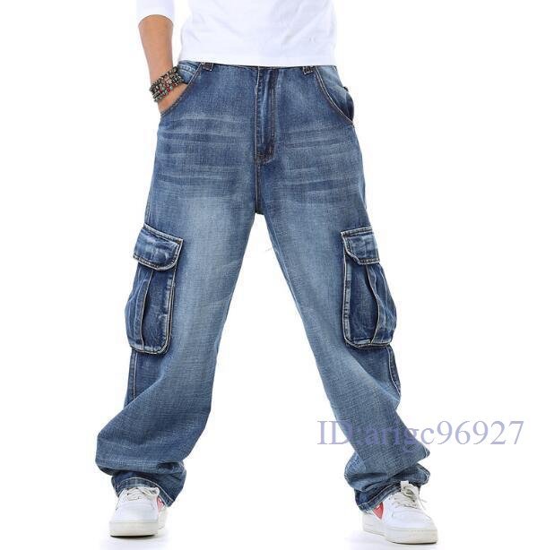 Q846☆新品☆メンズジーンズバギーパンツポケット多いデニムパンツワークパンツ大きいサイズゆったり個性ブルーW30~W46サイズ選択