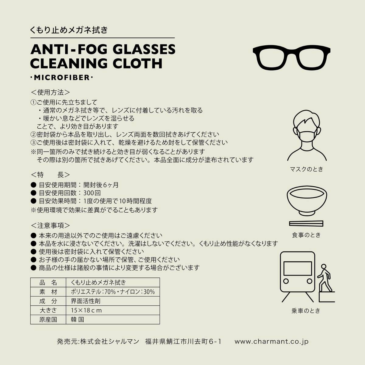 [CHARMANT] くもり止め メガネ拭き 効果1拭き12時間 300回使用可 マイクロファイバー LC234 99 GR